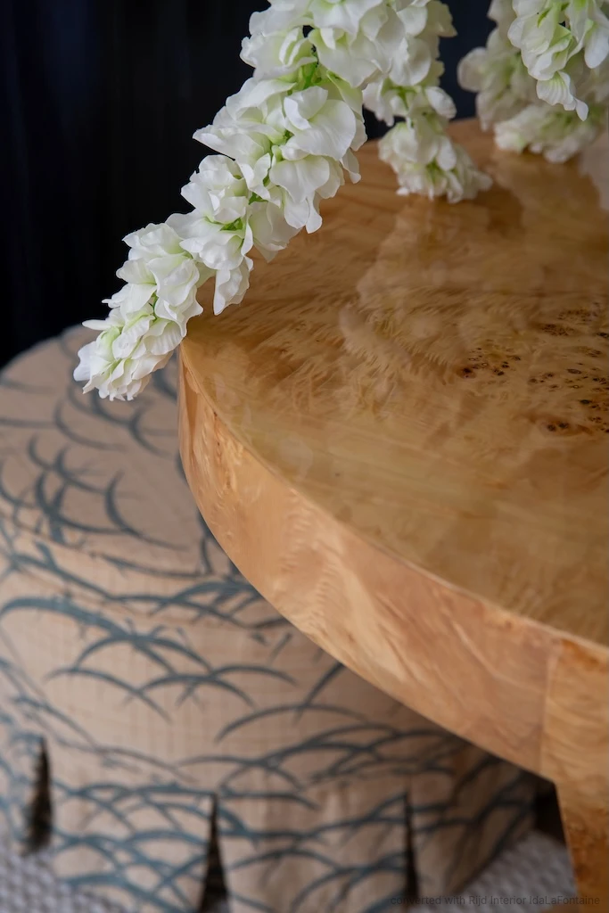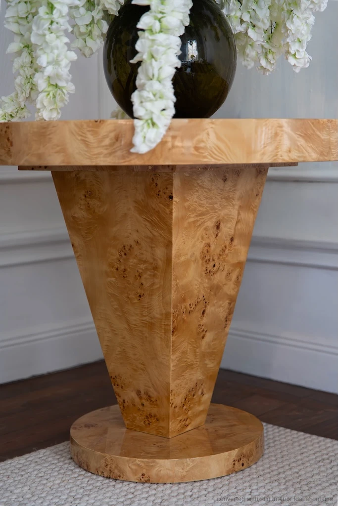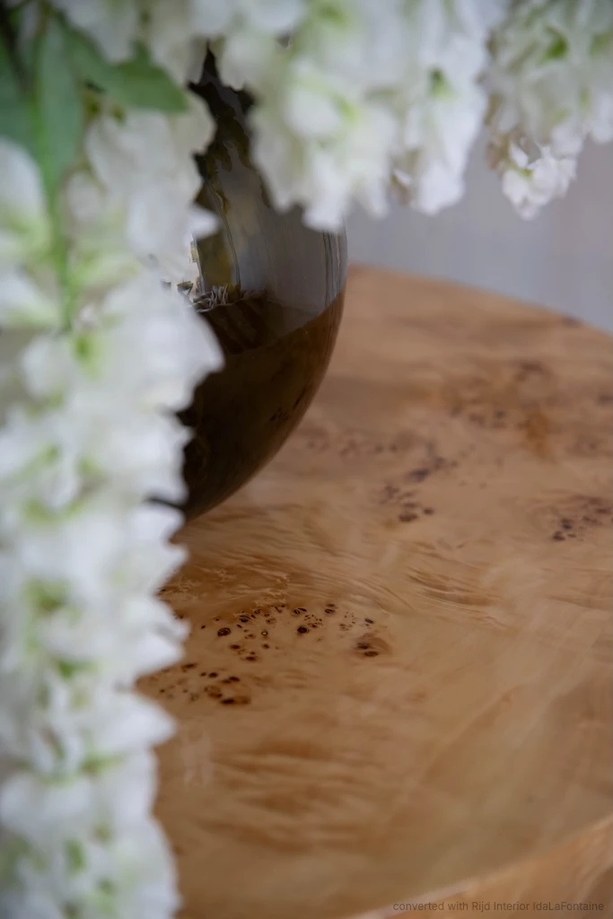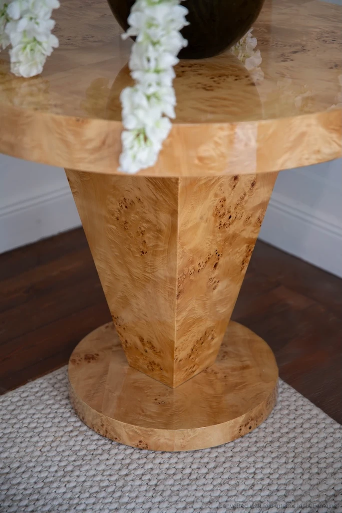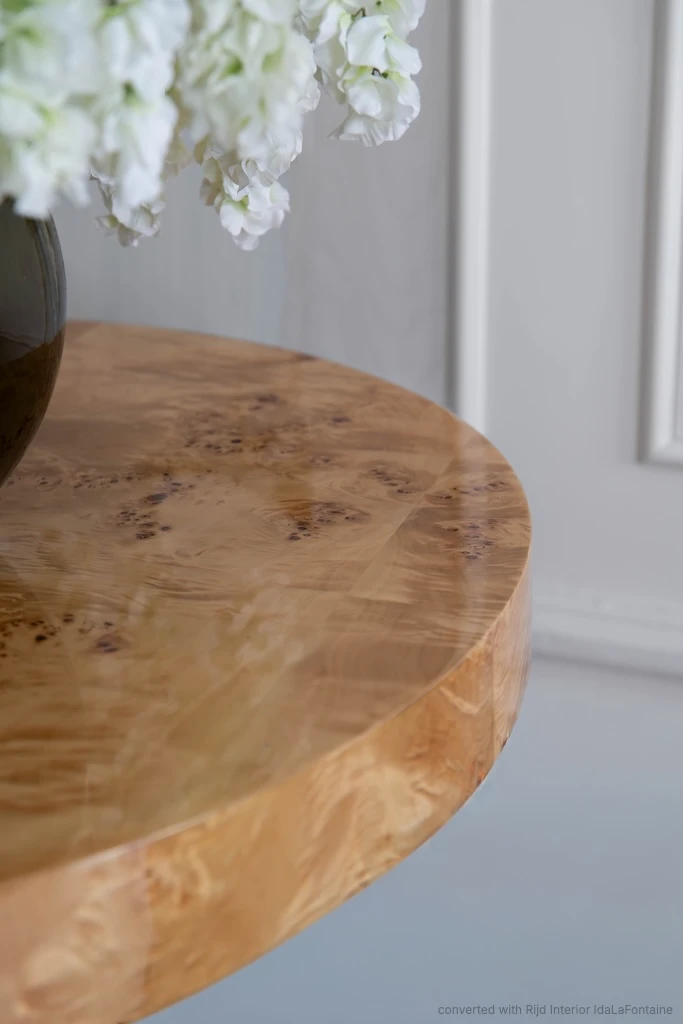 Welcome guests with our elegant round center table, a perfect anchor for your foyer to create a lasting first impression. See it as a canvas for your personal style. Use varying heights, textures, and layers to create a curated look with items like a vase, books or a lamp. Adrian Center Table is crafted with the finest burl veneer and the high gloss finish enhances the natural beauty of the wood and creates a lustrous and exquisite surface. It can also be used as a dining table and we can of course make it bigger. Also available in a high gloss walnut finish.