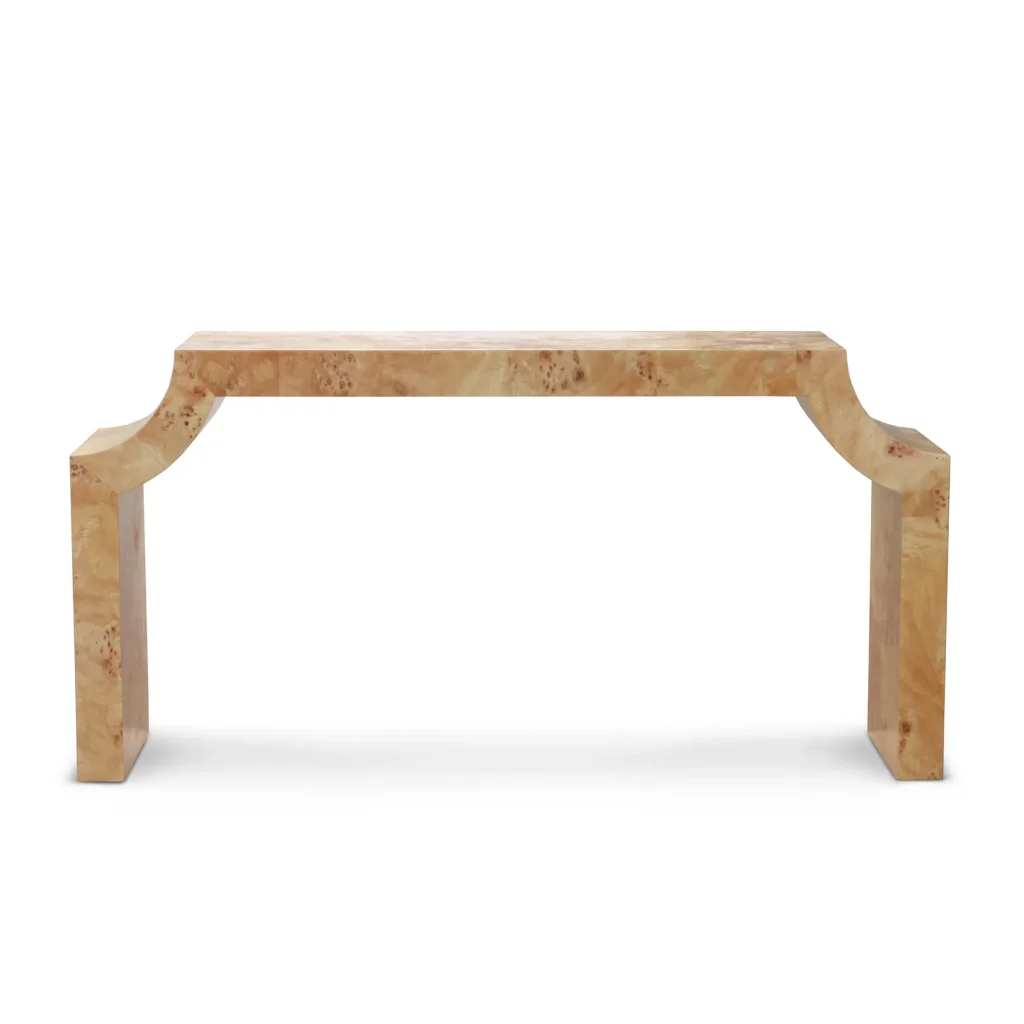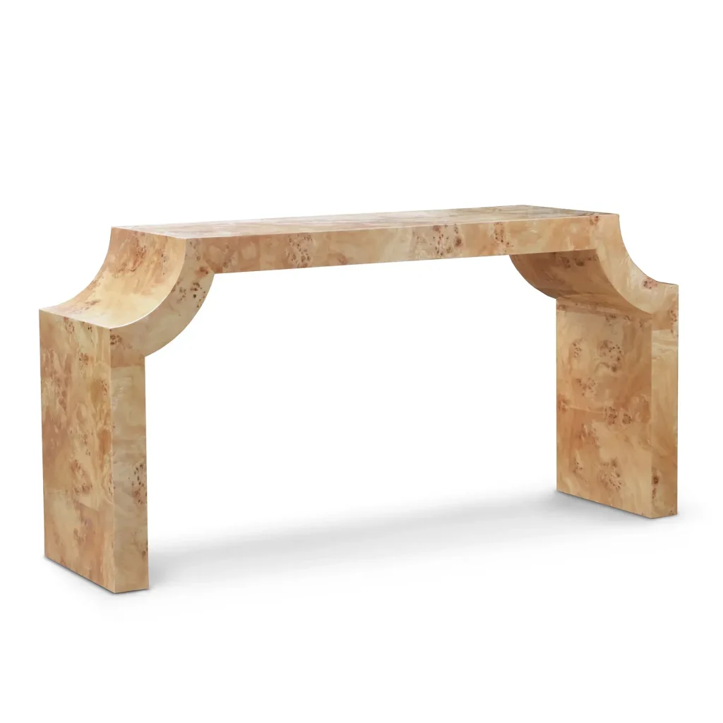 Meet Adrian, our exclusive design sideboard crafted with the finest burl veneer. The high gloss finish enhances the natural beauty of the wood and creates a lustrous and exquisite surface. Elevate your living space with this stunning piece that seamlessly blends artistry with functionality. Each curve and contour is expertly crafted to perfection, resulting in a piece that exudes elegance from every angle. Whether gracing the foyer, living room, or hallway, this console table commands attention and becomes the focal point of any space.