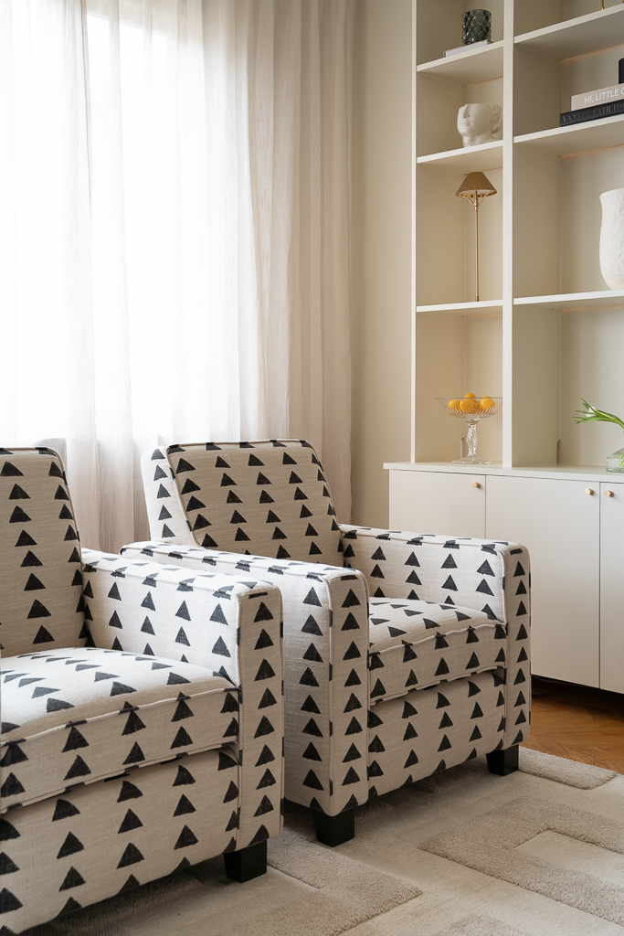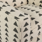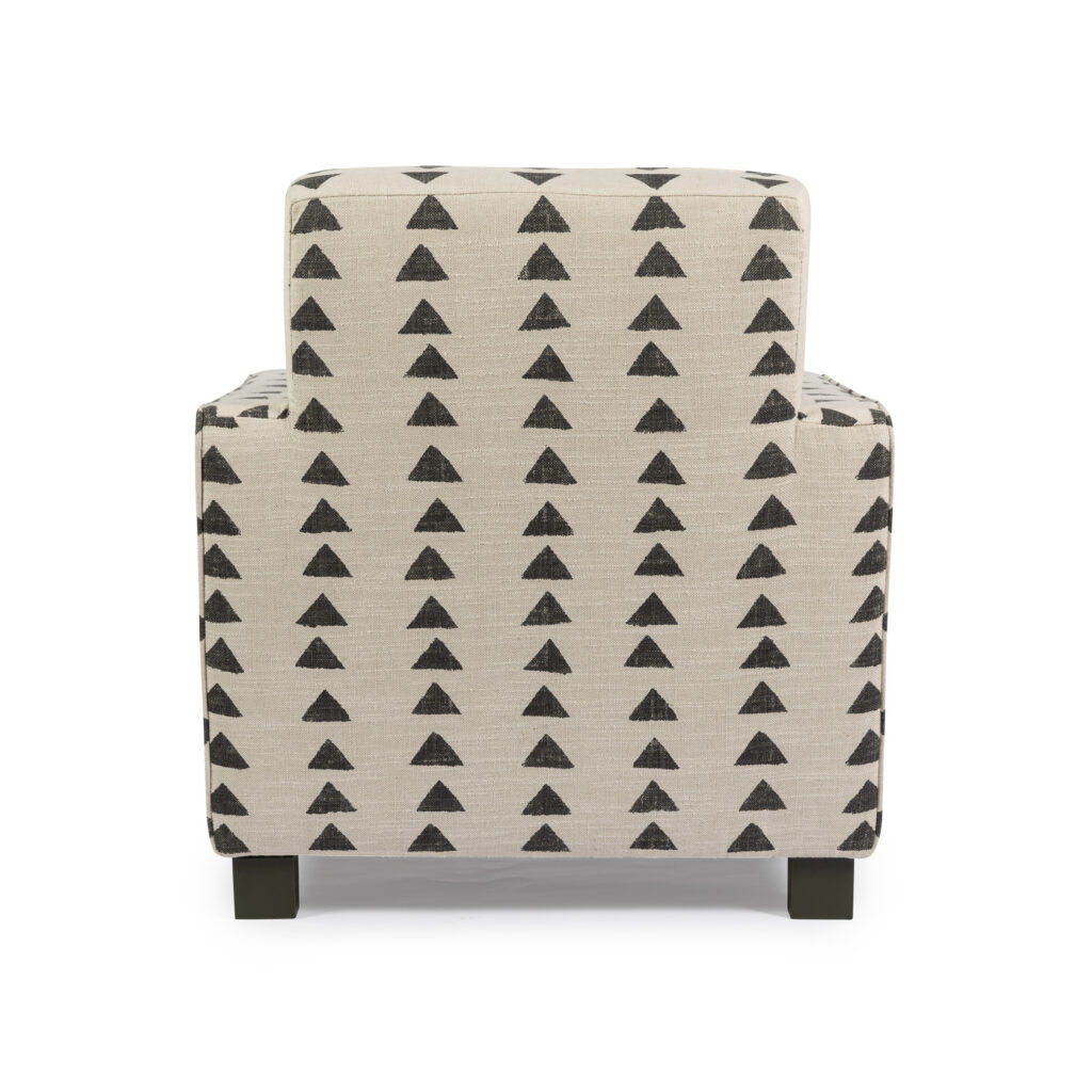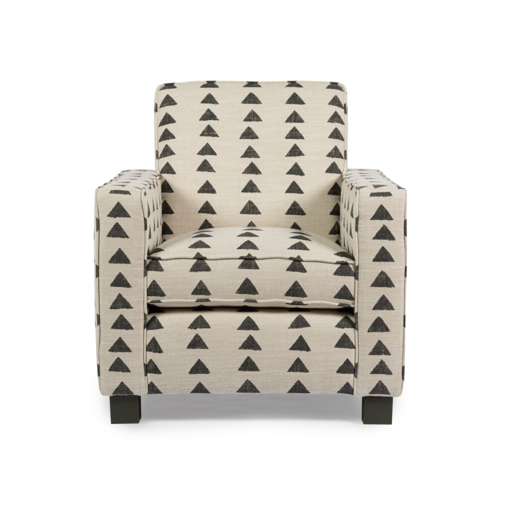 Sleek lines with the comfort of a lounge chair. This chair is made for compact living with a strong sense of attitude. Perfect for both a modern home or a more traditional home as the lines are classic. The expression comes down to the choice of fabric and trims/piping. These club chairs work wonders in pair as it frames any space. Add a small side table in between for a styled look. We have upholstered this Caspian club chair in the geometric black and white "Boho Triangle" fabric. Is has a hand painted look and consists of 75 % cotton and 25 % linen. The legs on this chair have a bold dark green high gloss finish, but the choice of leg finish is yours. Made in EU.