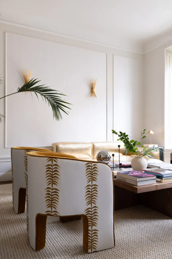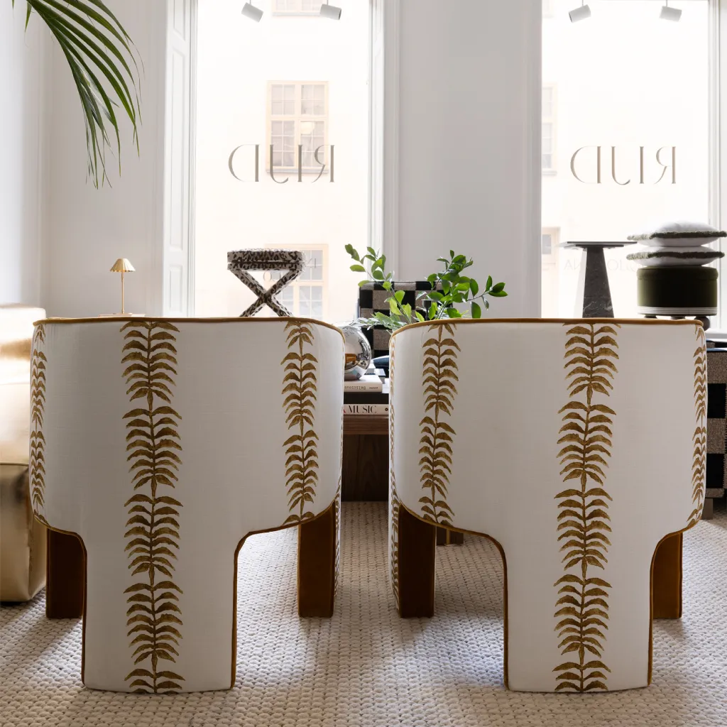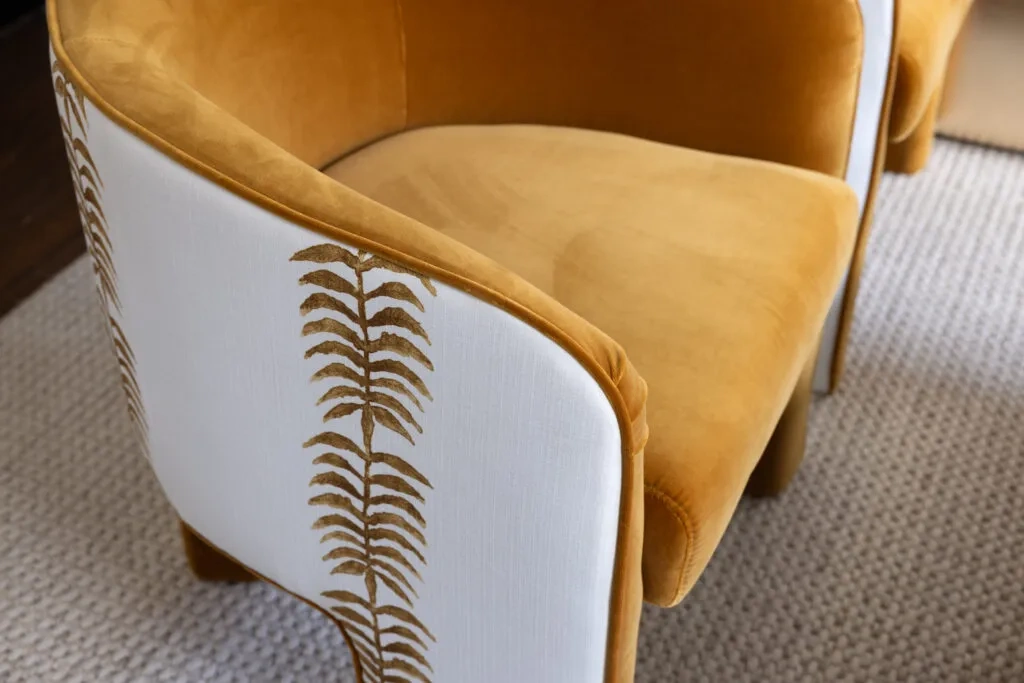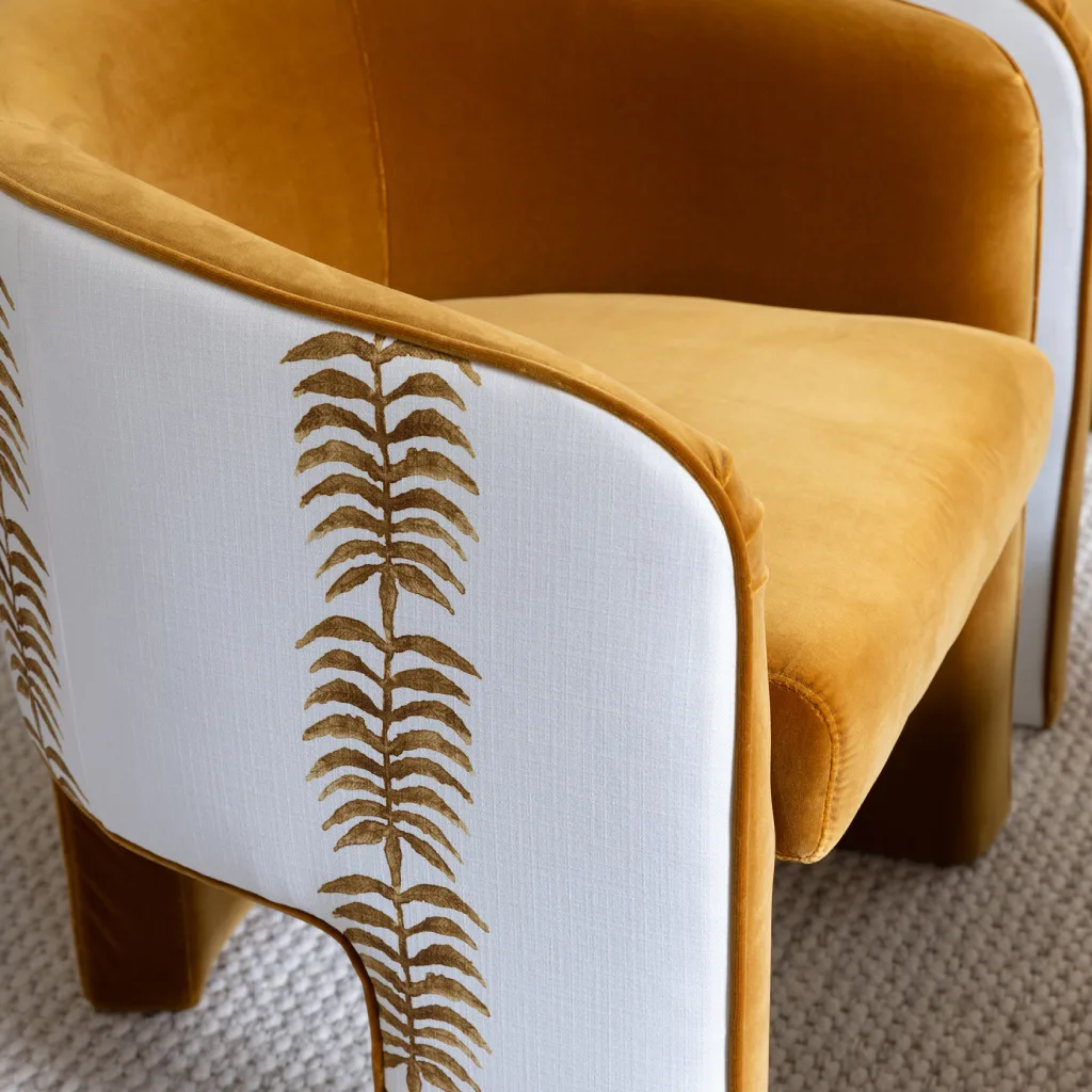 Sleek and design-y. This lounge chair fits everywhere due to the curved back and the width of only 70cm. It can be used in a seating area or by itself as a piece-de-resistance. Nobody puts Baby in a corner, but Florian is perfect for just that space. We all have that odd corner in our home that needs a bit of love - add Florian and a small side table and voila - you have a new installment that will enhance the overall look of the area. Florian has three wide legs and curved back, it is the ultimate piece for contrast piping as it enhances the intricate design. Pair with the Florian sofa for a complete look or just let it be a stand-out piece on its own. Made in EU. This particular piece is made of two different fabrics. The front is made in a luxurious velvet fabric that match the gorgeous palm leaf pattern on the back.