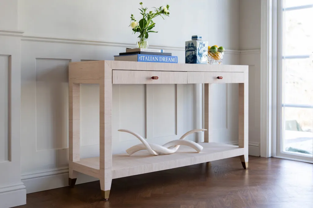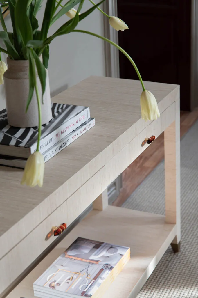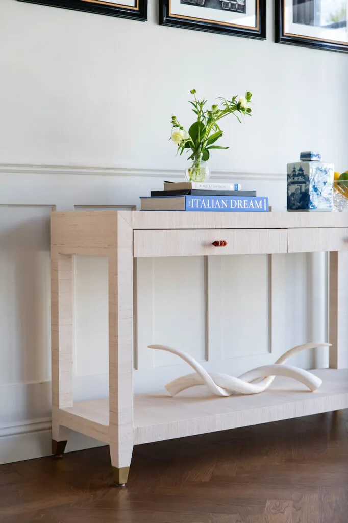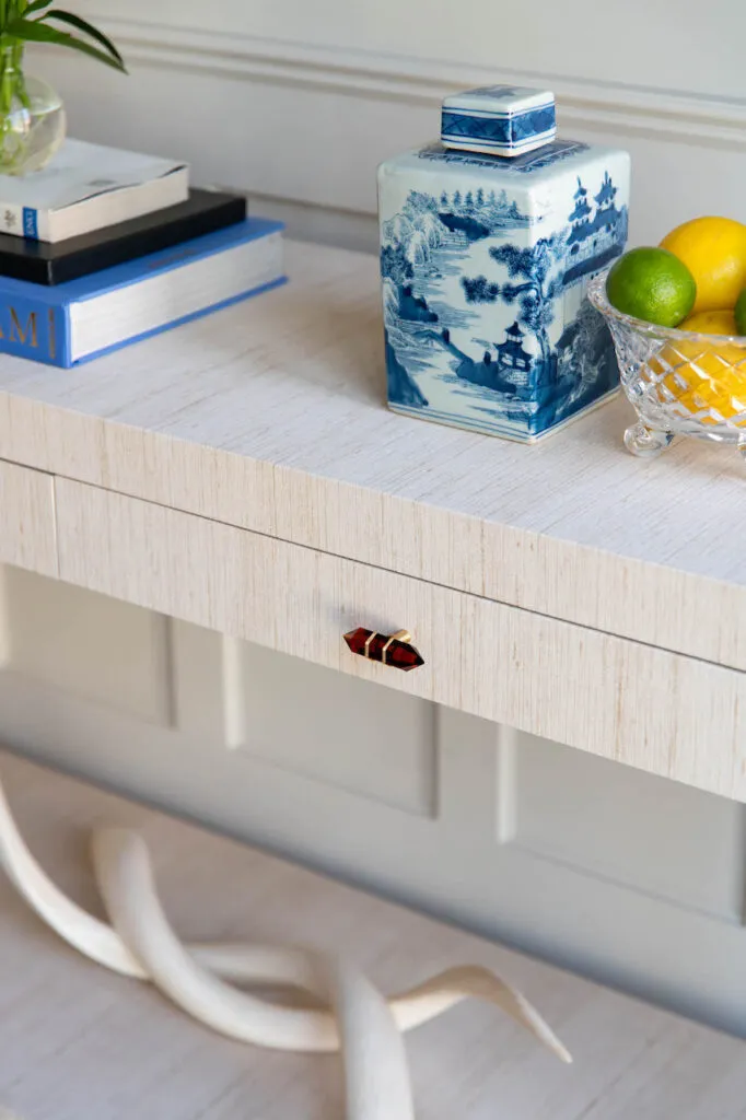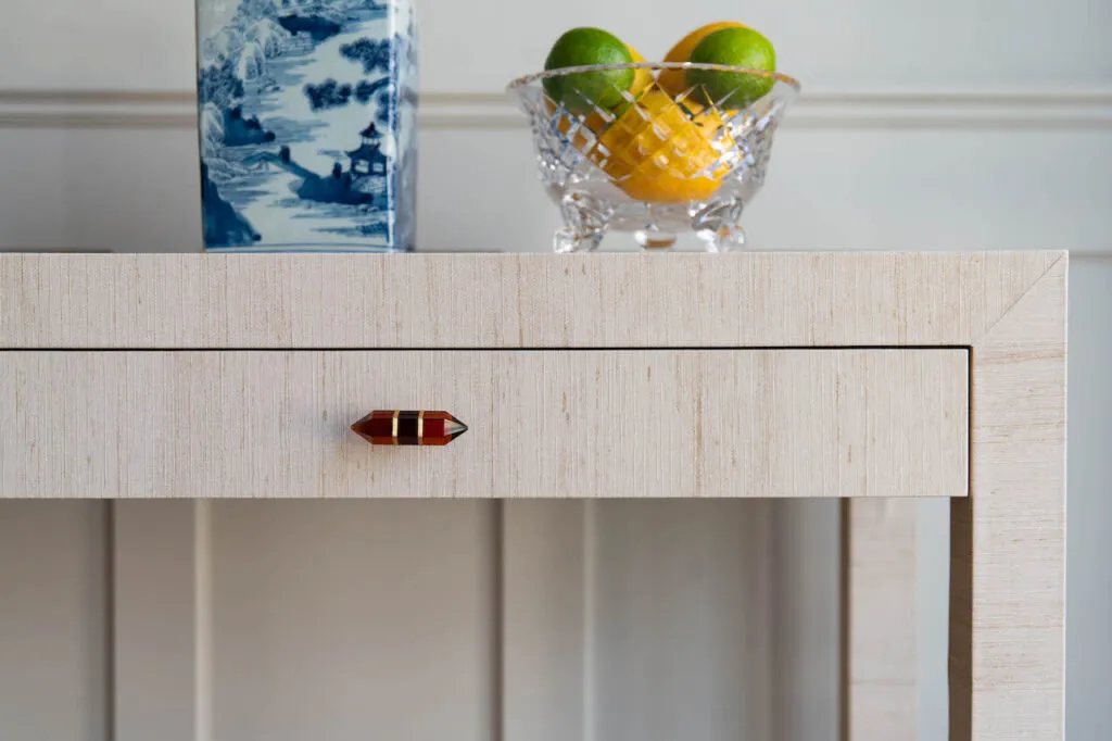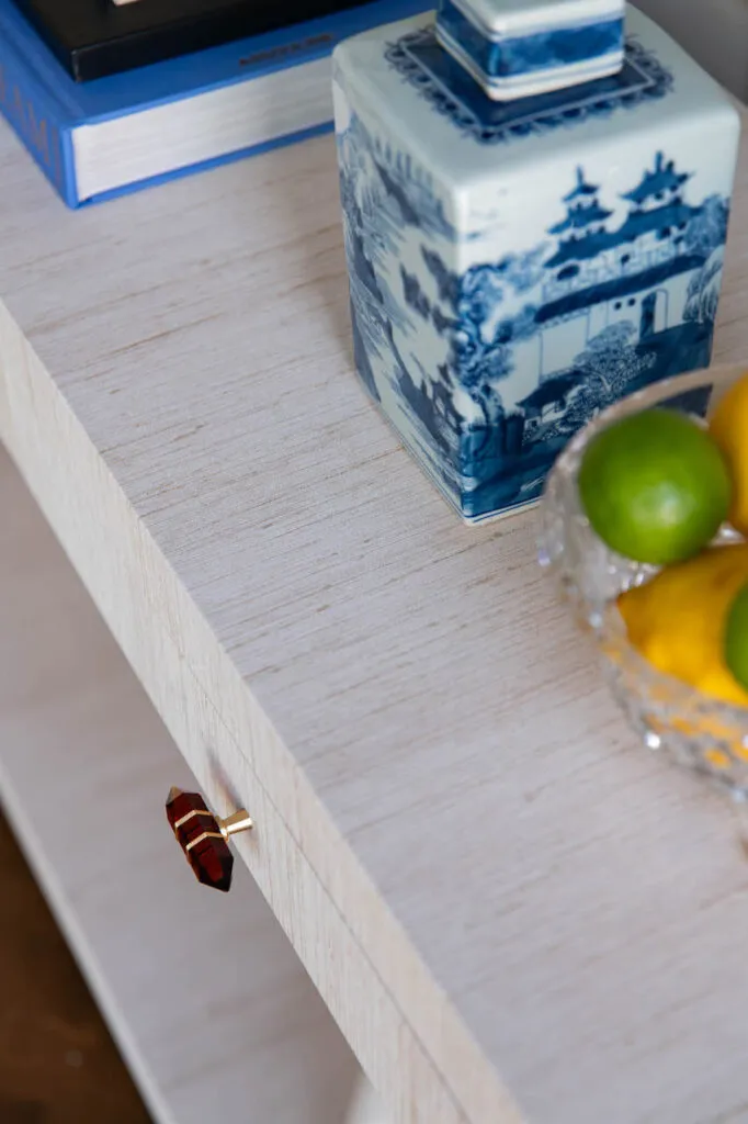 George Collection consists of grasscloth furniture with gemstone pulls. The tables are true perfection and craftsmanship designed from scratch by the RIJD design duo Caroline and Susanne. We proudly present our furniture wrapped in lustrous silk grasscloth (wipe'able, don't worry) and we even went as far as adding gemstone pulls in your color of choice - tigers eye, green emerald, blue sapphire and a brandy coloured gemstone. George console table has a simple design yet dressed for success. An accent table to keep in your hallway, bedroom or living room. It fits everywhere! The lustrous structure of the grasscloth is giving a very luxe and soft allure. It is simple, yet outstanding. Like a Celine jacket. No fuzz, just great quality and attention to detail. George comes with option of 3 different coloured handles/knobs in gemstone on a brushed brass base.
