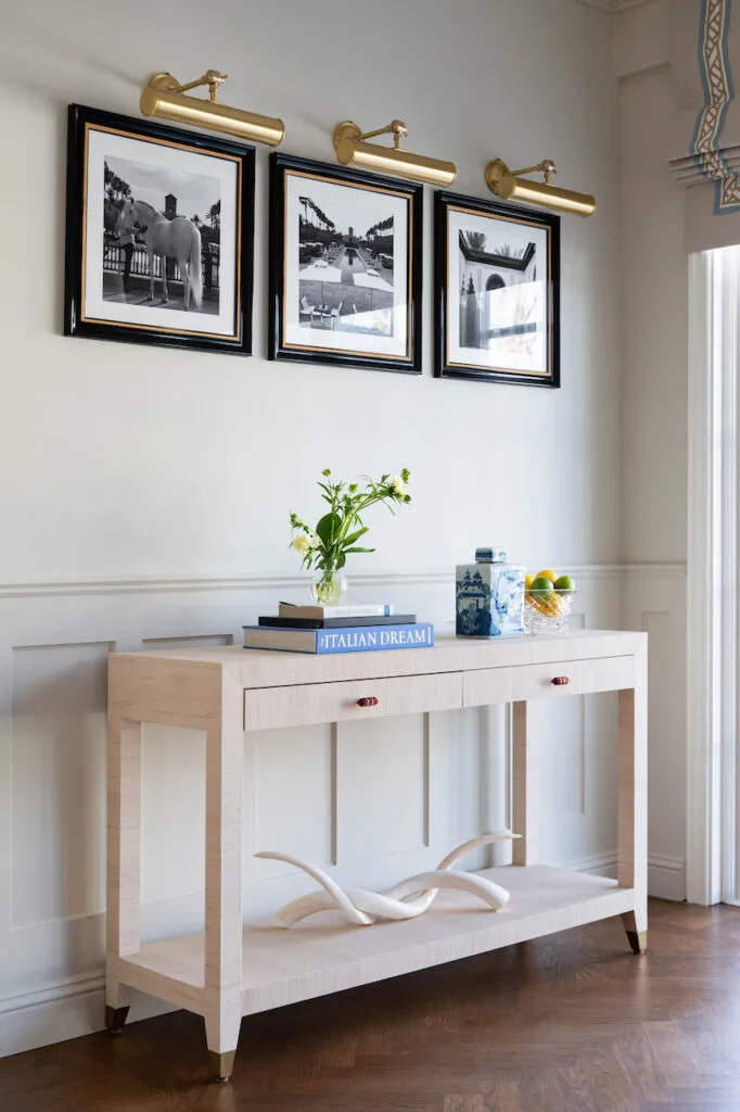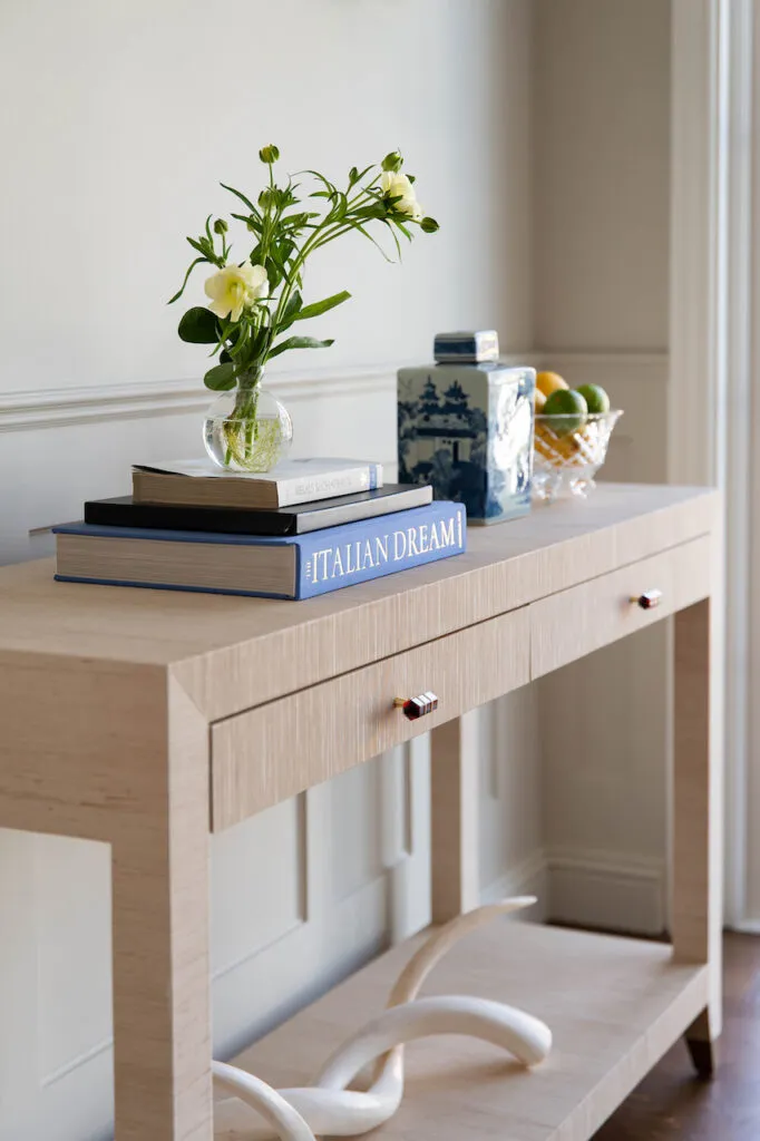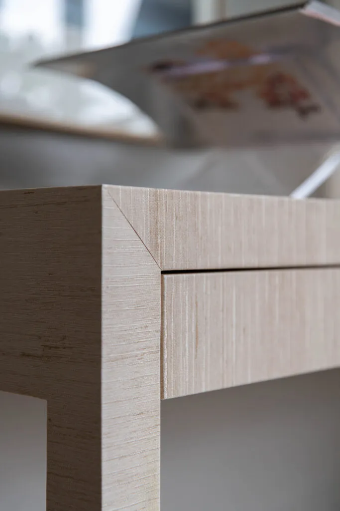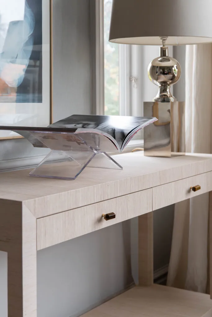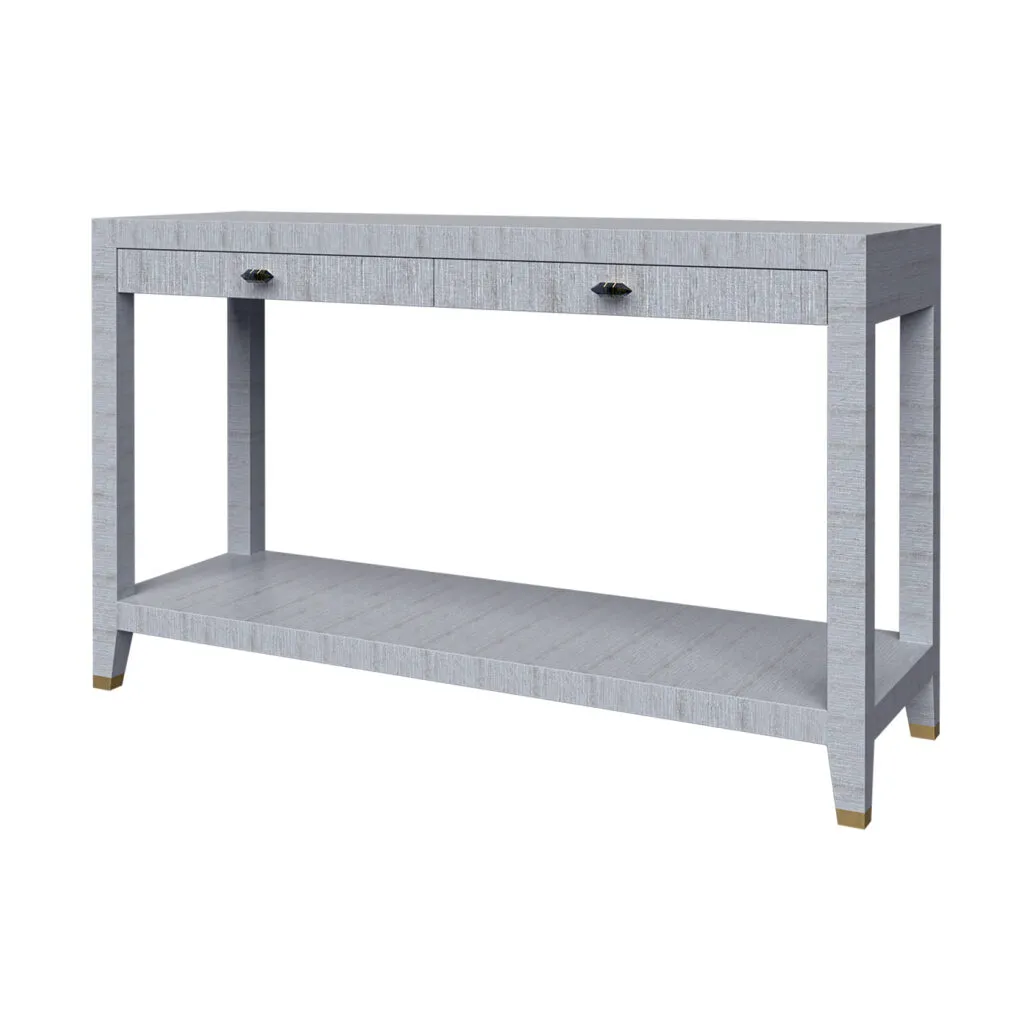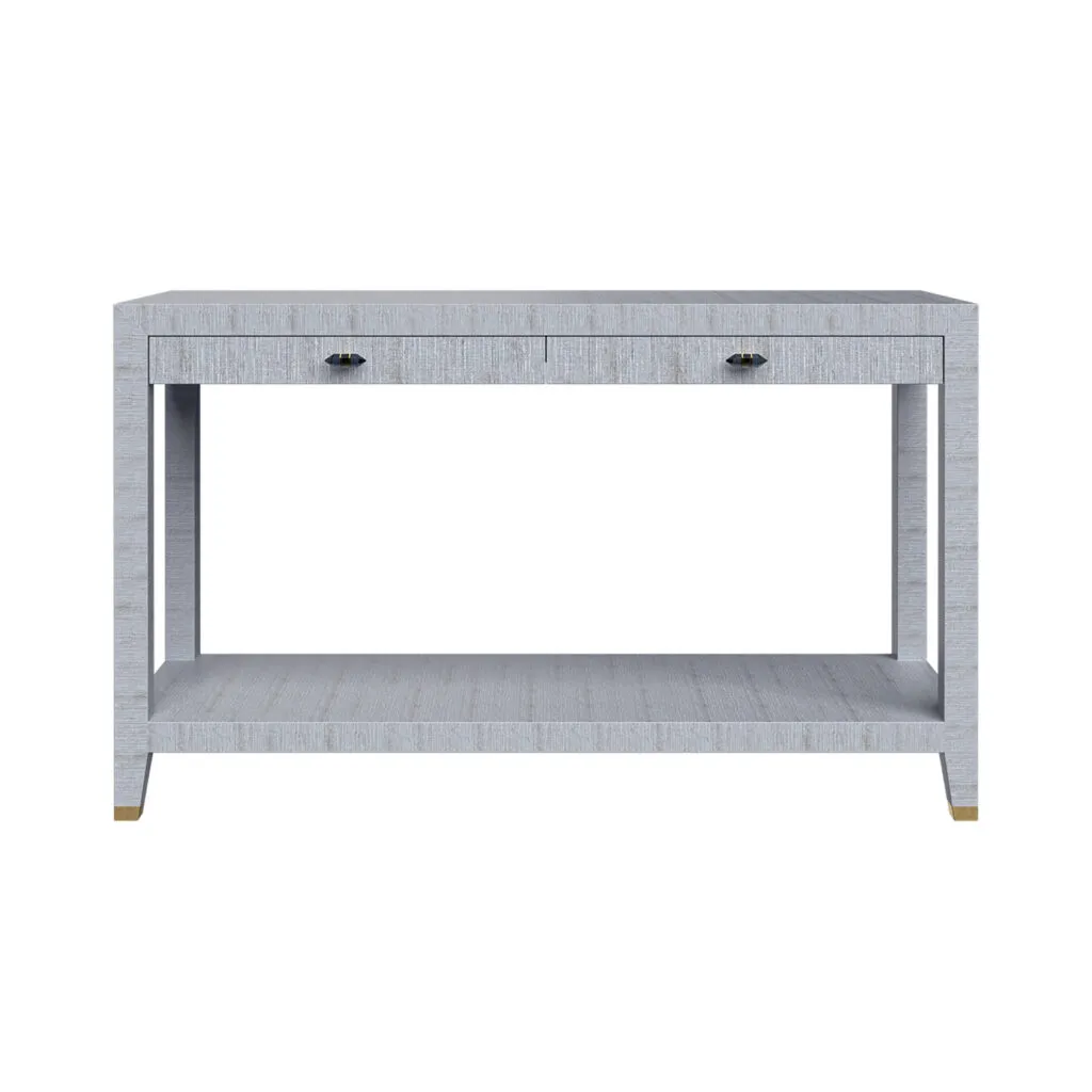 George Collection consists of grasscloth furniture with gemstone pulls. The tables are true perfection and craftsmanship designed from scratch by the RIJD design duo Caroline and Susanne. We proudly present our furniture wrapped in lustrous silk grasscloth (wipe'able, don't worry) and we even went as far as adding gemstone pulls in your color of choice - tigers eye, green emerald, blue sapphire and a brandy coloured gemstone. George console table has a simple design yet dressed for success. An accent table to keep in your hallway, bedroom or living room. It fits everywhere! The lustrous structure of the grasscloth is giving a very luxe and soft allure. It is simple, yet outstanding. Like a Celine jacket. No fuzz, just great quality and attention to detail. George comes with option of 3 different coloured handles/knobs in gemstone on a brushed brass base.