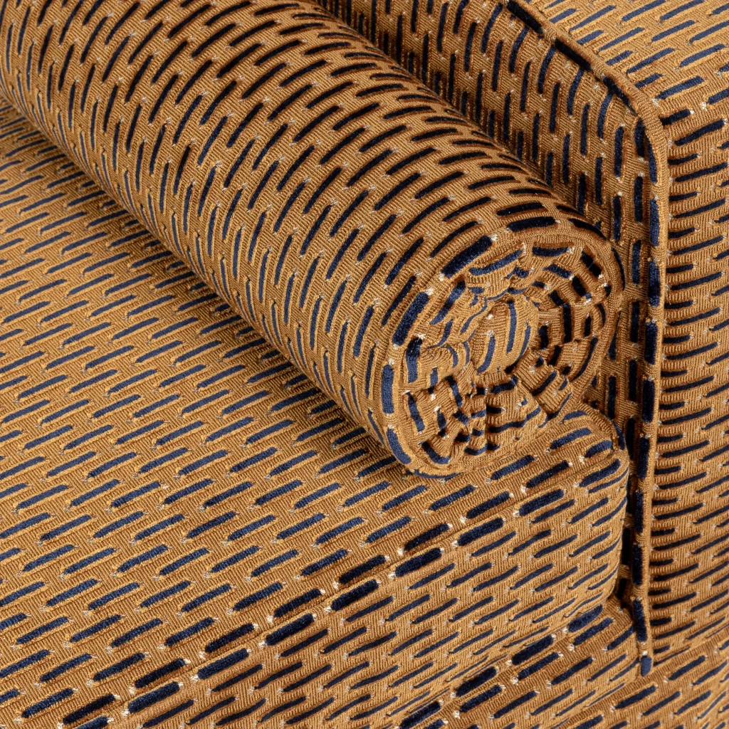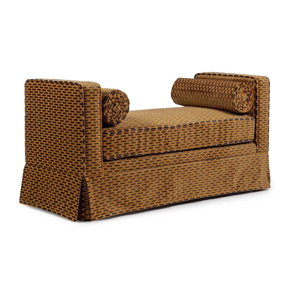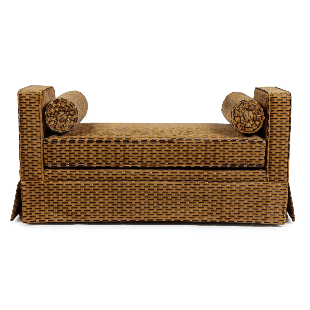 This skirted piece in a shorter version (120 cm) is made in the gorgeous Paris Vienne fabric from Misia. It is a cut and uncut velvet which could not be a better tribute to the Art Deco movement. Its finely ridged and textured warp enhances the geometric design, a procession of long, dotted satin lines. The seven colorways have been created subtly, in shades which express the luxury and refinement on-board a train as emblematic as the Orient Express.