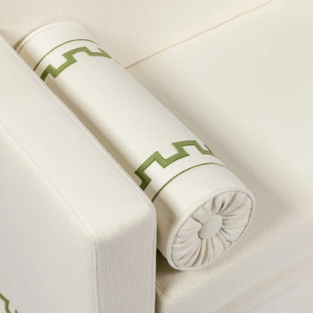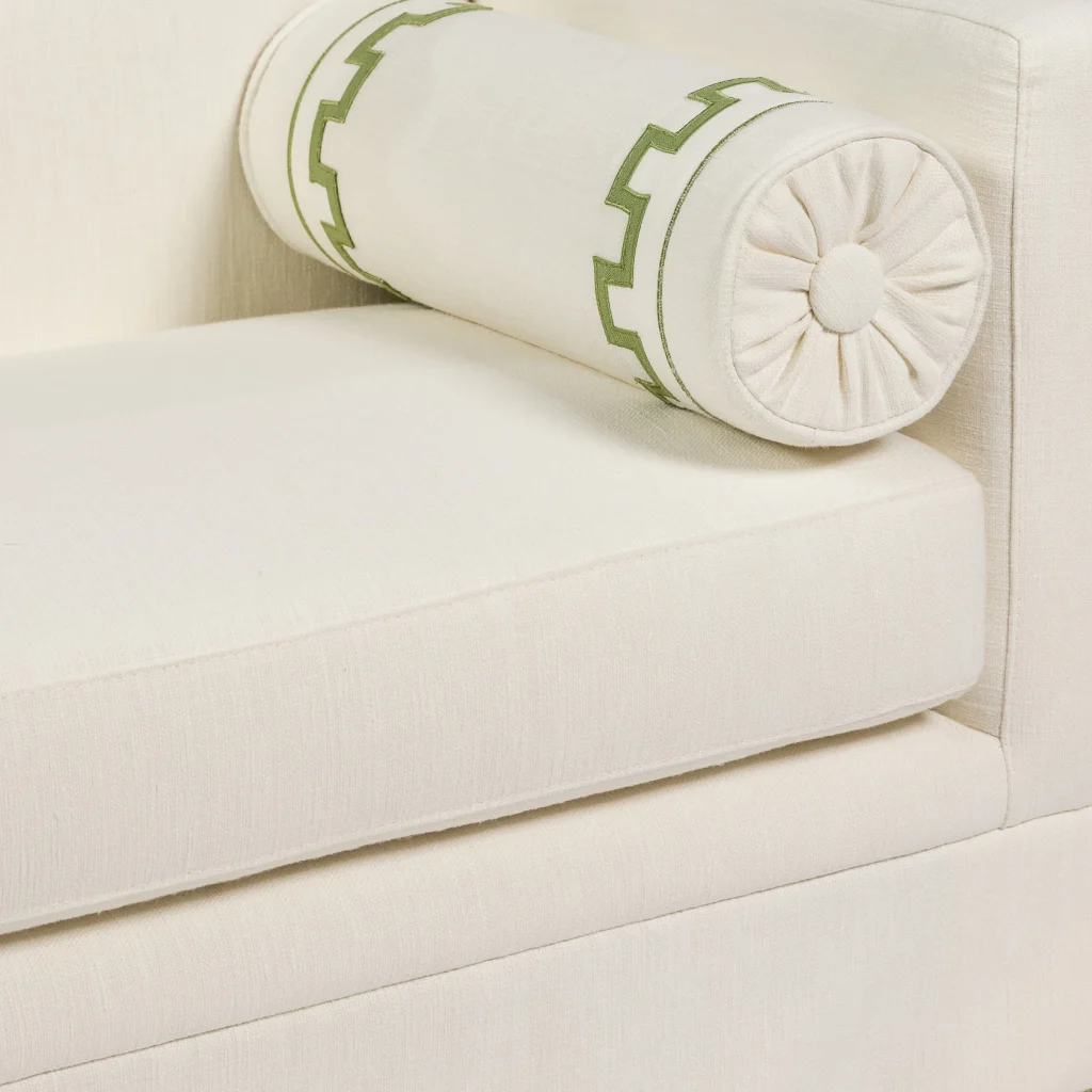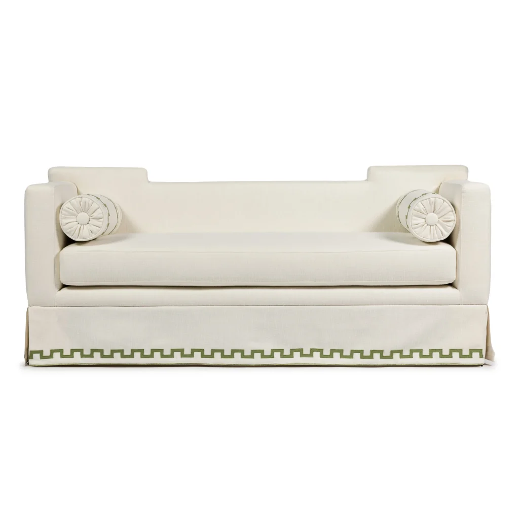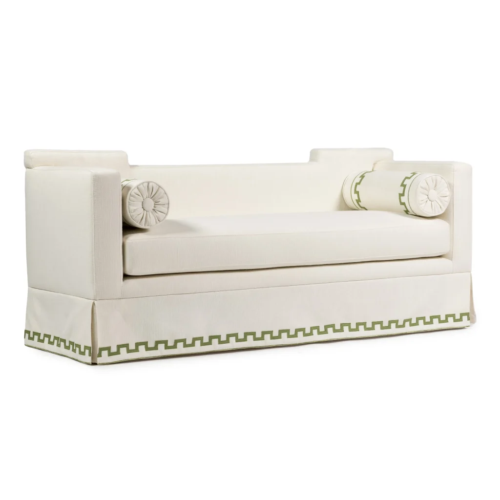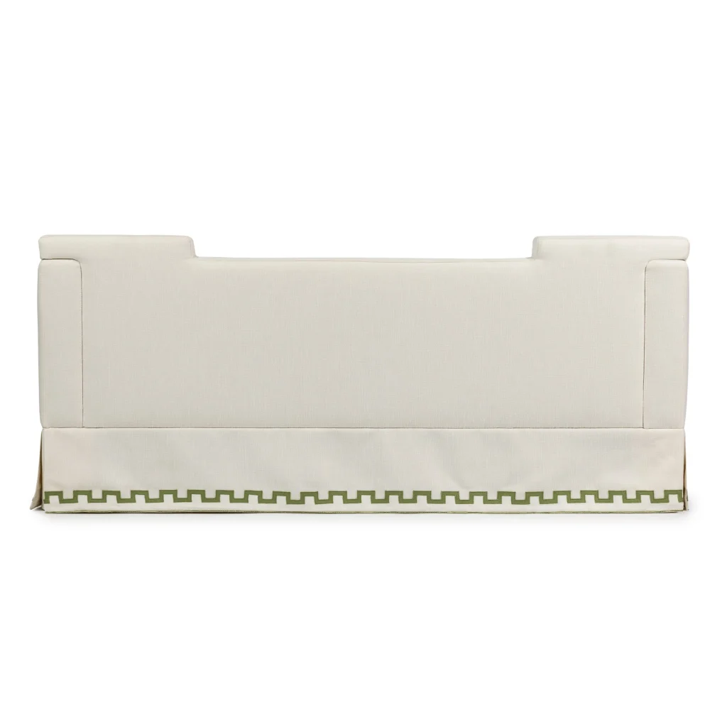 Like our superstar and bestseller Julian - this is a product development off the same base. We added a backrest with an elegant shape to add interest to the odd wall, corridor etc. This piece is not one for lounging, it’s the pin brooche in your jacket. Not necessary per se but it is that cherry on top that makes an interior go from 'nice' to 'wow'. This skirted version of Julian is upholstered in an Easy Clean fabric and is adorned with the beautiful Devon tape from Samuel & Sons. It is a refined two-tone geometric border inspired by classical dentil molding and features a linen-on-linen applique. Julian is made in the EU.