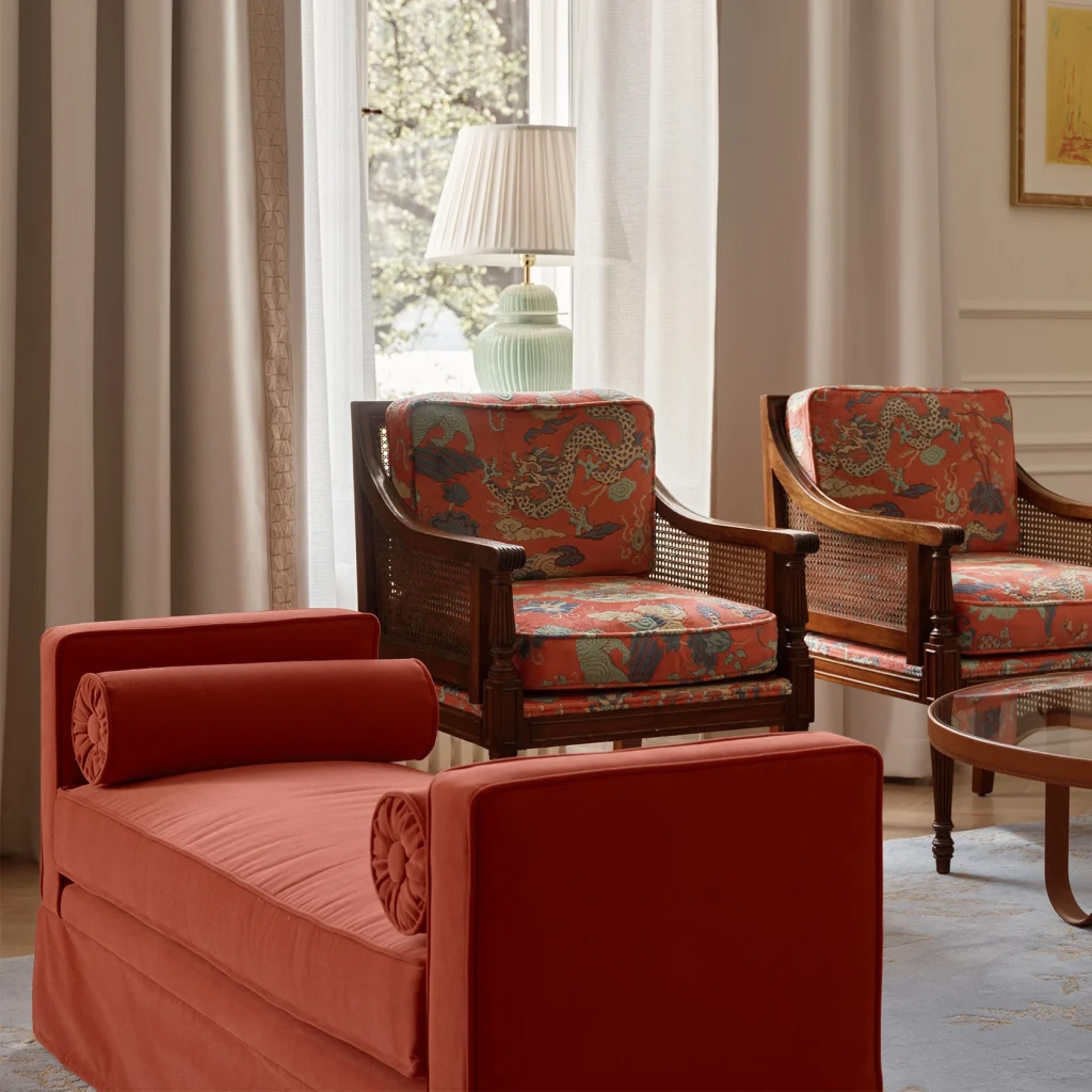 This velvet jacquard, woven on a traditional loom offers a refined interpretation of the tigers’ coat. Composition: 78% Viscose, 11% Cotton, 11% Polyester