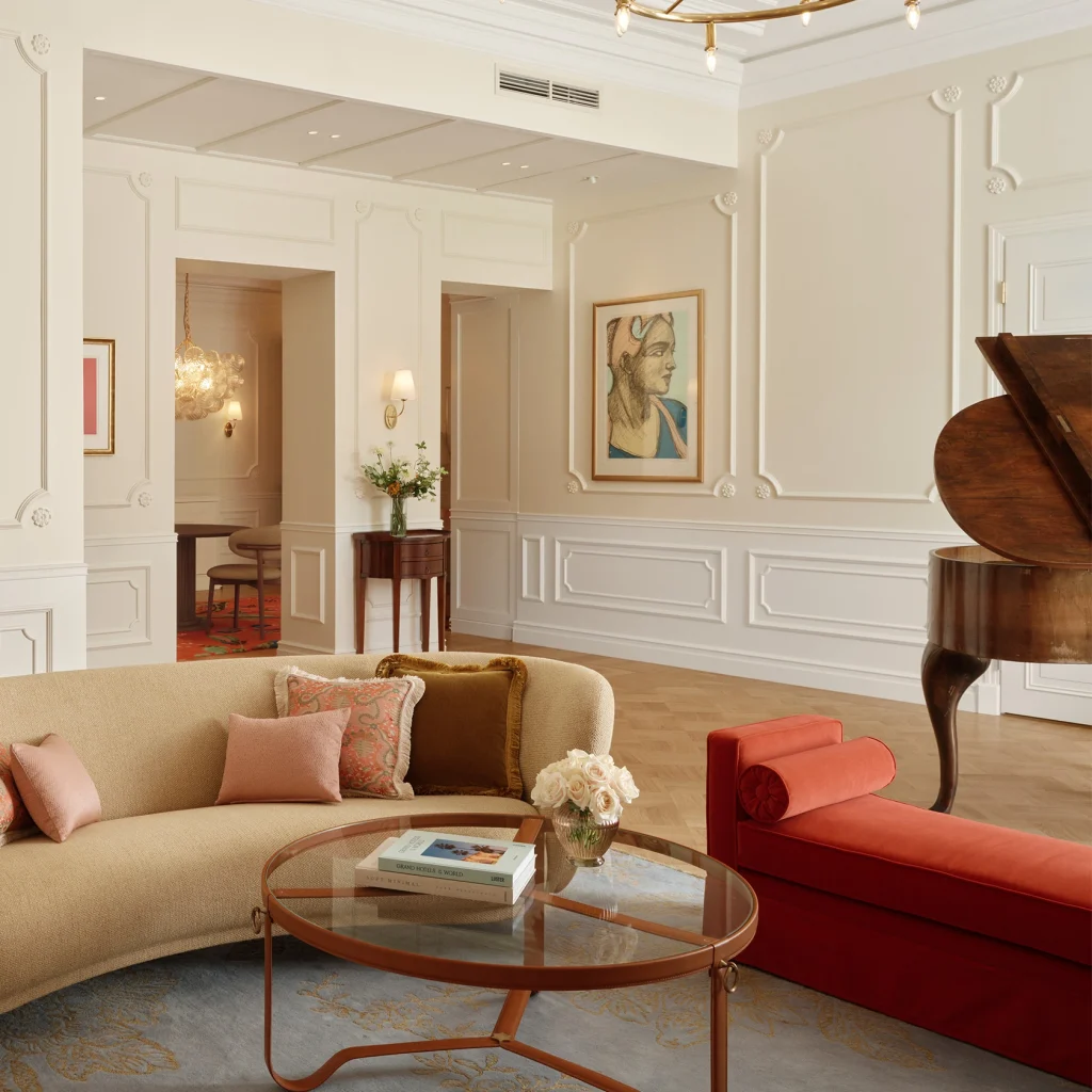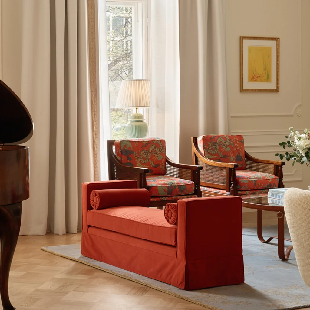 This skirted piece is made in a smooth colorful and easy clean velvet from Kirkby. And don't be surprised if you see this version at the amazing five star Hotel Kämp in Helsinki.