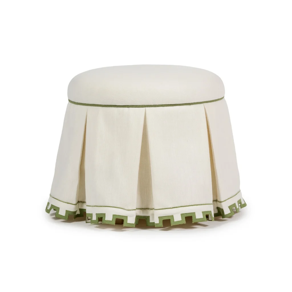 This high skirted version of Laurent is upholstered in an Easy Clean fabric and is adorned with both a contrast piping and the beautiful Devon tape from Samuel & Sons. It is a refined two-tone geometric border inspired by classical dentil molding and features a linen-on-linen applique.