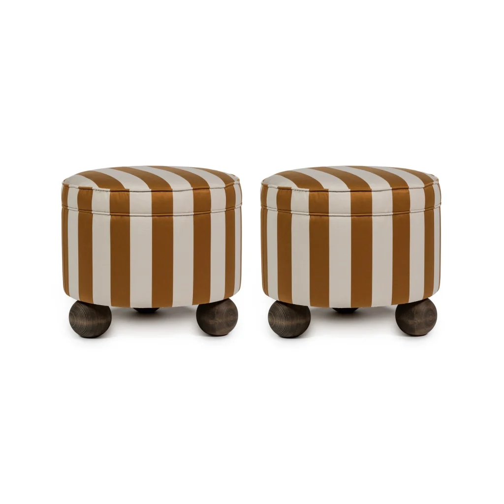 This Laurent pouf is dressed in the fabric "Rayure Ischia" from Nobilis. With its broad, maximalist stripes on a satin fabric reminiscent of silk, Nobilis revisits the decorative style of 19th-century English Regency. The figures recreate the charm of the aristocratic homes of yesteryear in interiors, while creating a Mediterranean ambience.