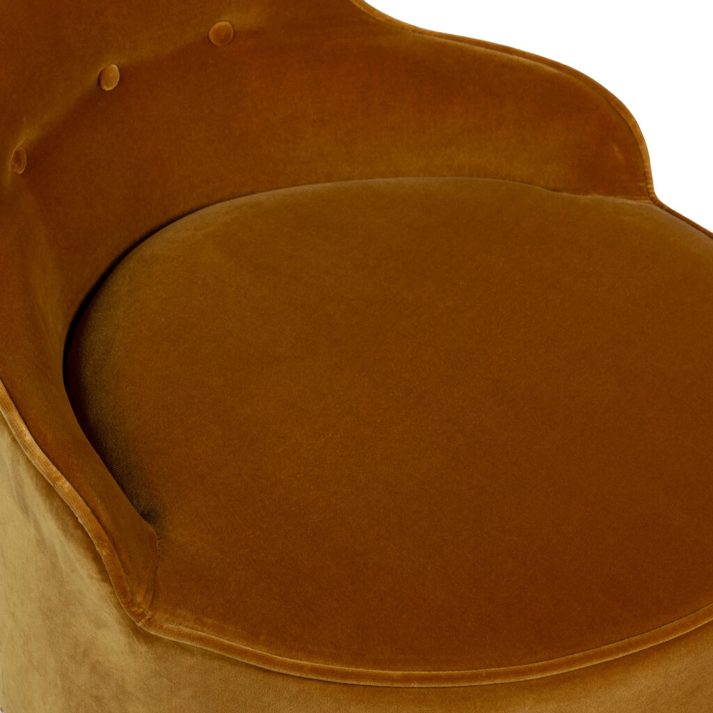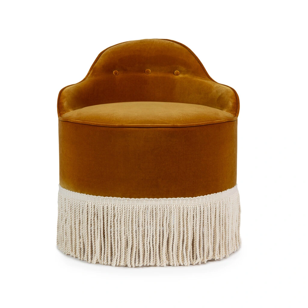 Bring out the Hollywood star in yourself! Our LOU vanity stool is an exquisite piece of furniture designed to add style, elegance, and comfort to one's vanity area. It is crafted with high-quality materials and attention to detail, showcasing fine craftsmanship. The design of Lou vanity stool is typically plush and ornate, featuring intricate pipings, decorative accents, or embellishments. Comfort is key for our Lou, as it has padded seats and backrests, providing an indulgent seating experience. Like a little sun, perky and warm. We love Lou in this amber color with an off white RIJD buillion fringe. What's not to love. Placed in a walk-in closet or a bedroom it is the perfect 'pop' to the interior. Made in the EU.
