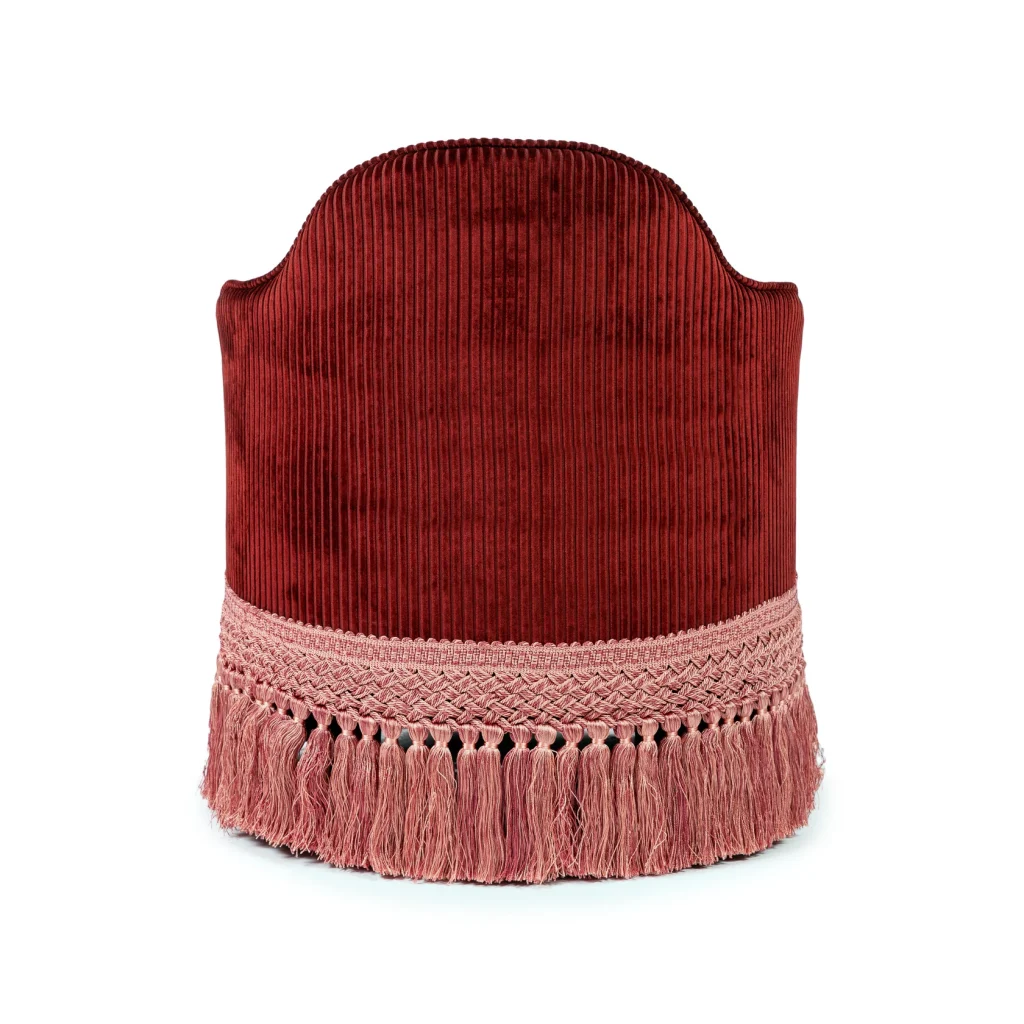 This piece is dressed in a burgundy velvet striped fabric from Fishbacher, and the luxurious Rouen tassel fringe from Samuel & Sons makes this Lou a true knockout!