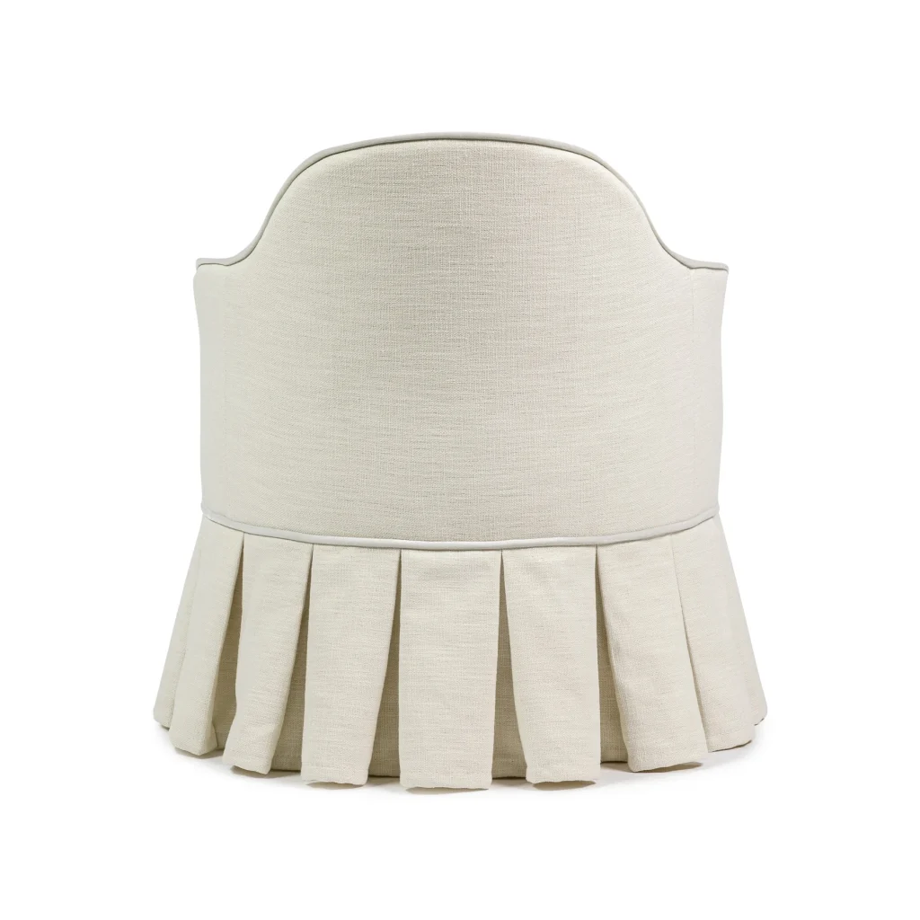 Comfort is key for our Lou, as it has padded seats and backrests, providing an indulgent seating experience. This skirted piece is upholstered in a Ivory colored easy-clean linen fabric and has a beautiful contrast piping in Seafoam velvet. The base of Lou vanity stool is made of high-quality solid wood which adds stability and durability to the piece. Ultimately, Lou is not 'just' a functional piece of furniture but also a statement piece that enhances the overall aesthetics of a vanity area, bringing a sense of opulence and refinement to the space. Handmade in EU.