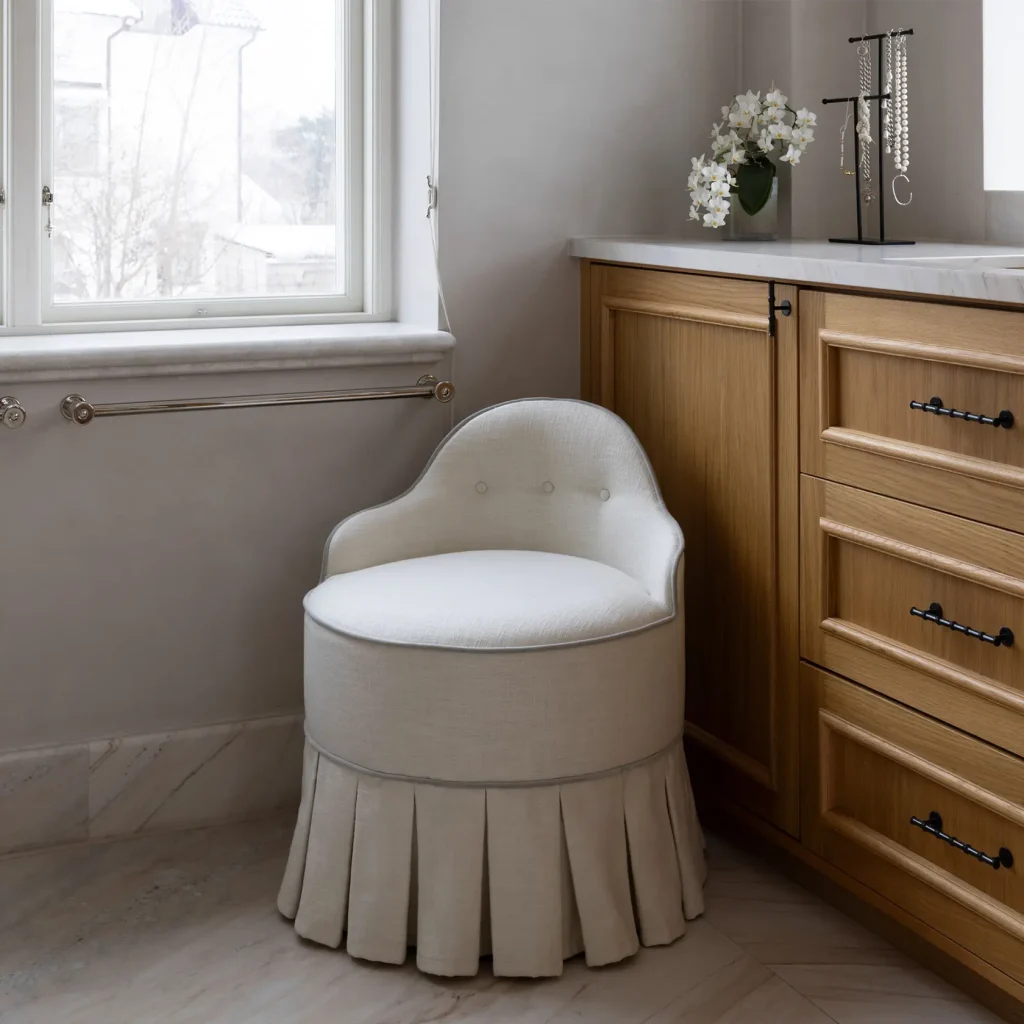 Bring out the Hollywood star in yourself! Our LOU vanity stool is an exquisite piece of furniture designed to add style, elegance, and comfort to one's vanity area. It is crafted with high-quality materials and attention to detail, showcasing fine craftsmanship. The design of Lou vanity stool is typically plush and ornate, featuring intricate pipings, decorative accents, or embellishments.