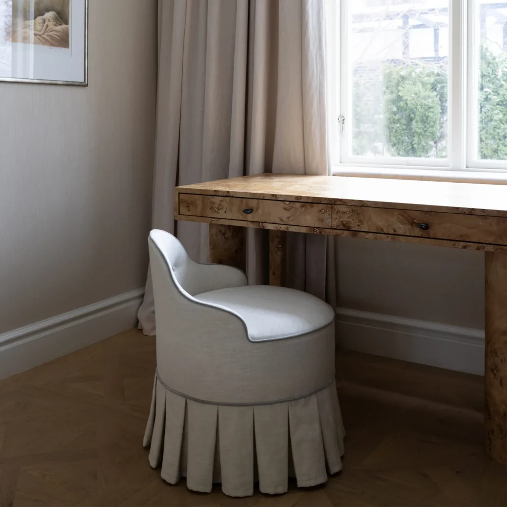 The choice of materials are currently linen material with choice of optional piping colors of velvet. Comfort is key for our Lou, as it has padded seats and backrests, providing an indulgent seating experience. The upholstery is somewhat lustrous linen, The base of Lou vanity stool is made of high-quality solid wood which adds stability and durability to the piece. Ultimately, Lou is not 'just' a functional piece of furniture but also a statement piece that enhances the overall aesthetics of a vanity area, bringing a sense of opulence and refinement to the space. Handmade in Europe.