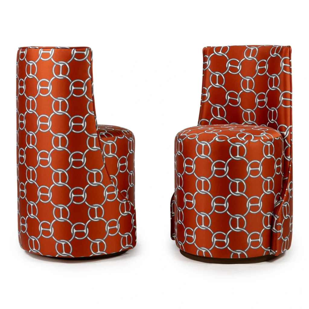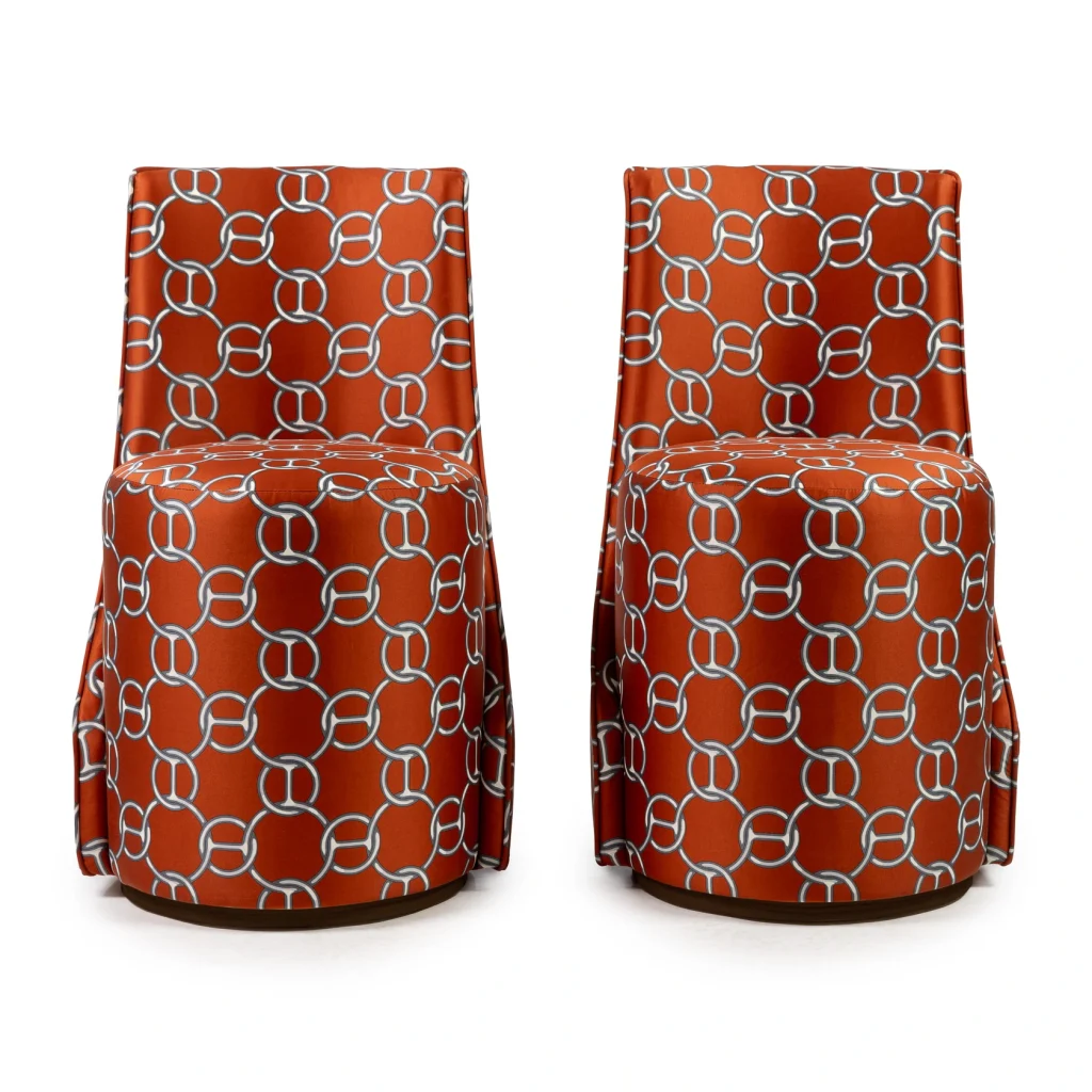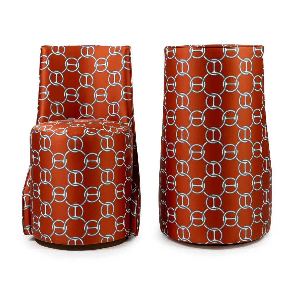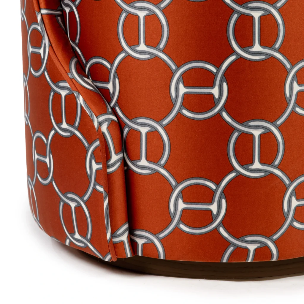 Proudly presenting an exceptional piece for collectors and design connoisseurs, this Louis stool is upholstered in the iconic Fil d’Argent fabric by Hermès, a discontinued and highly sought-after vintage textile. The warm terracotta ground is overlaid with the unmistakable interlocking chain motif, creating a bold yet elegant graphic presence. The fabric’s subtle sheen and depth of color reflect Hermès’ legendary craftsmanship and attention to detail.