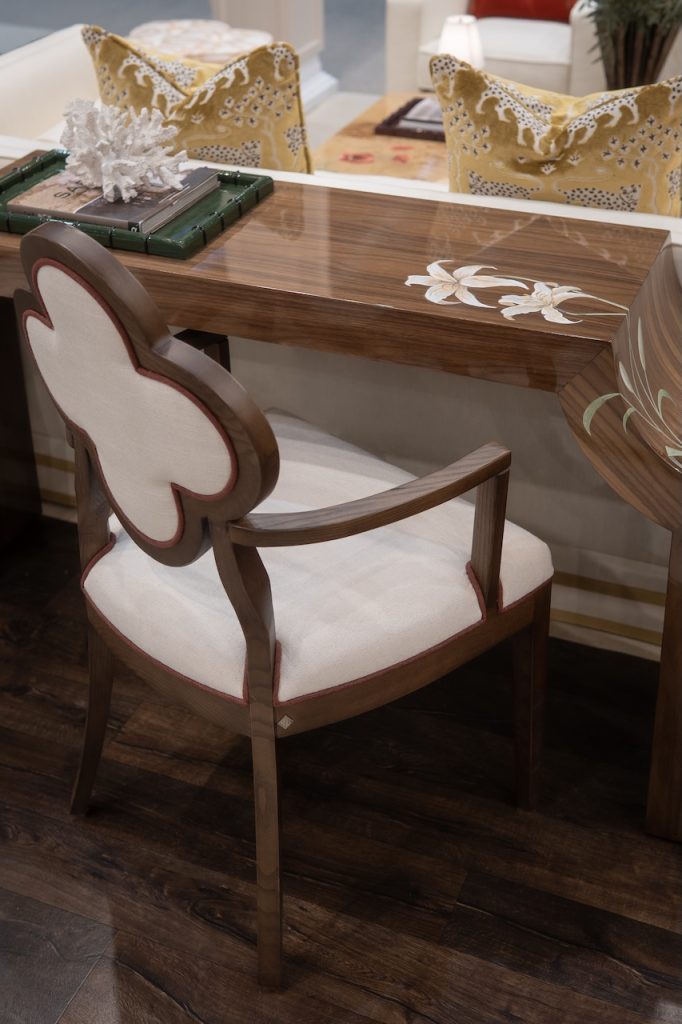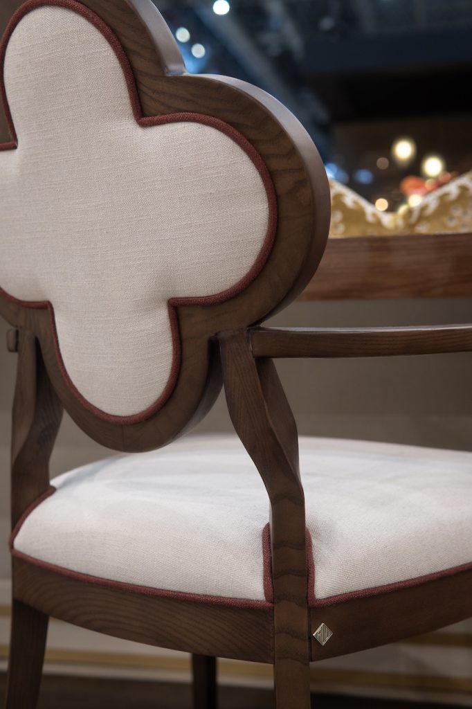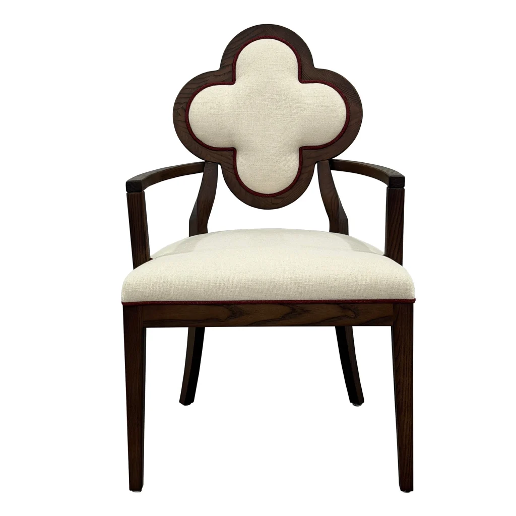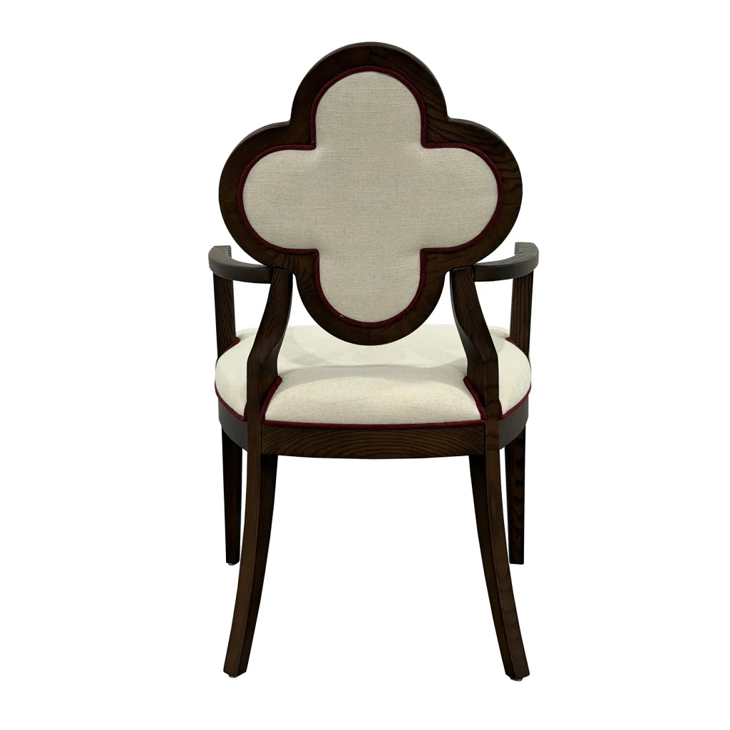 Meet Lucky, a chair that blends sculptural elegance and everyday comfort. This exquisite piece features a distinctive quatrefoil-shaped backrest, an architectural silhouette that instantly draws the eye. It is framed in rich, warm wood for a timeless, upscale look. The plush, linen-textured upholstery adds a soft, inviting touch, making it just as comfortable as it is beautiful.