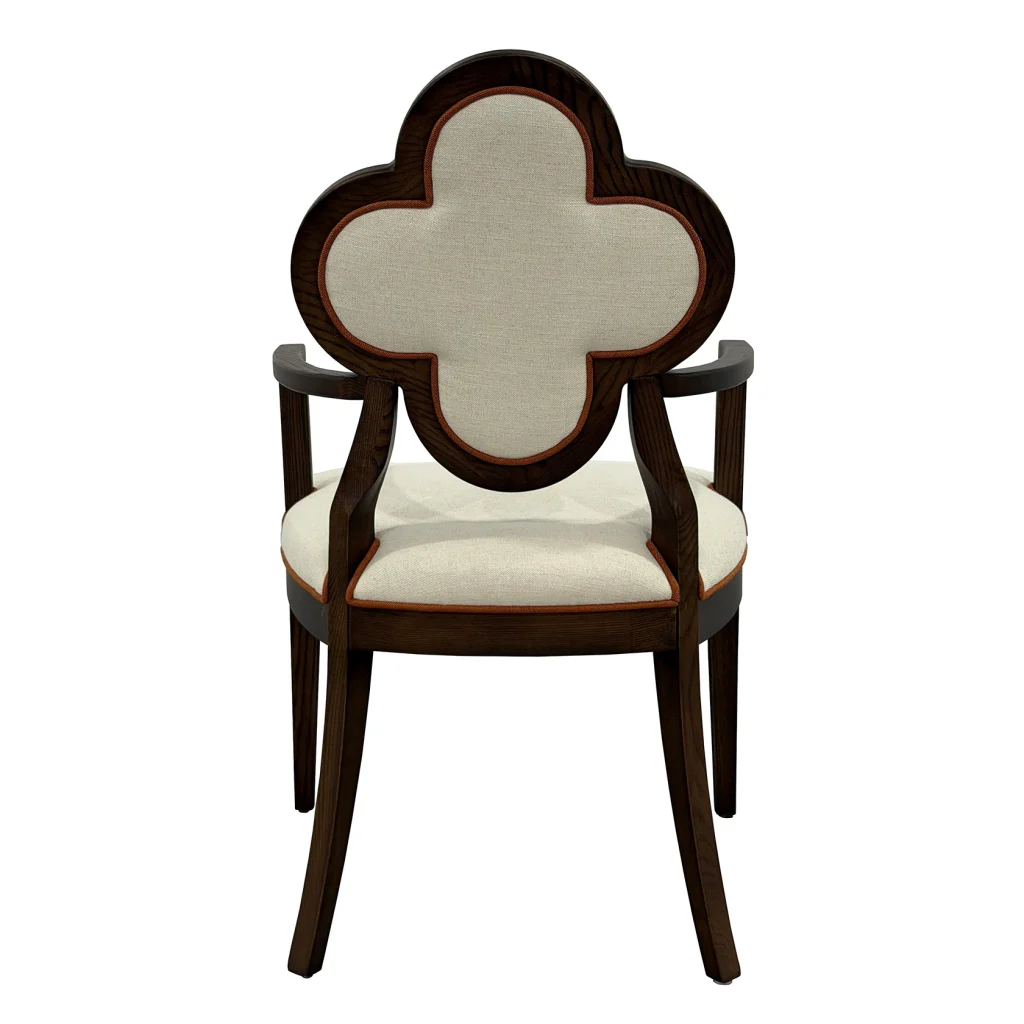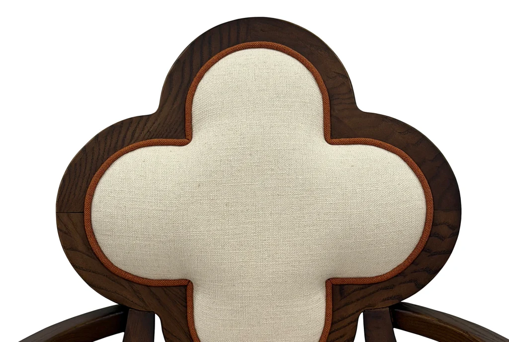 Meet Lucky, a chair that blends sculptural elegance and everyday comfort. This exquisite piece features a distinctive quatrefoil-shaped backrest, an architectural silhouette that instantly draws the eye. It is framed in rich, warm wood for a timeless, upscale look. The plush, linen-textured upholstery adds a soft, inviting touch, making it just as comfortable as it is beautiful.