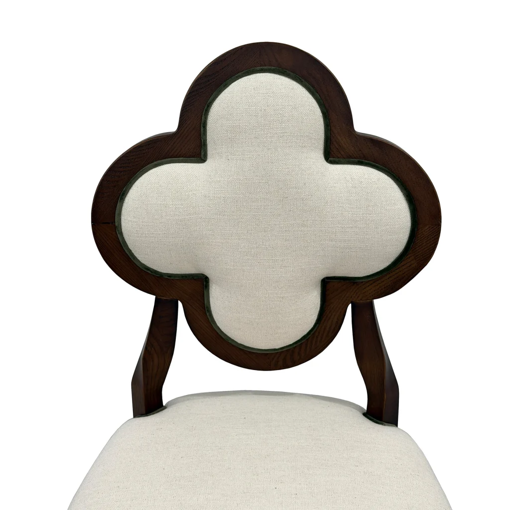 Meet Lucky, a chair that blends sculptural elegance and everyday comfort. This exquisite piece features a distinctive quatrefoil-shaped backrest, an architectural silhouette that instantly draws the eye. It is framed in rich, warm wood for a timeless, upscale look. The plush, linen-textured upholstery adds a soft, inviting touch, making it just as comfortable as it is beautiful.