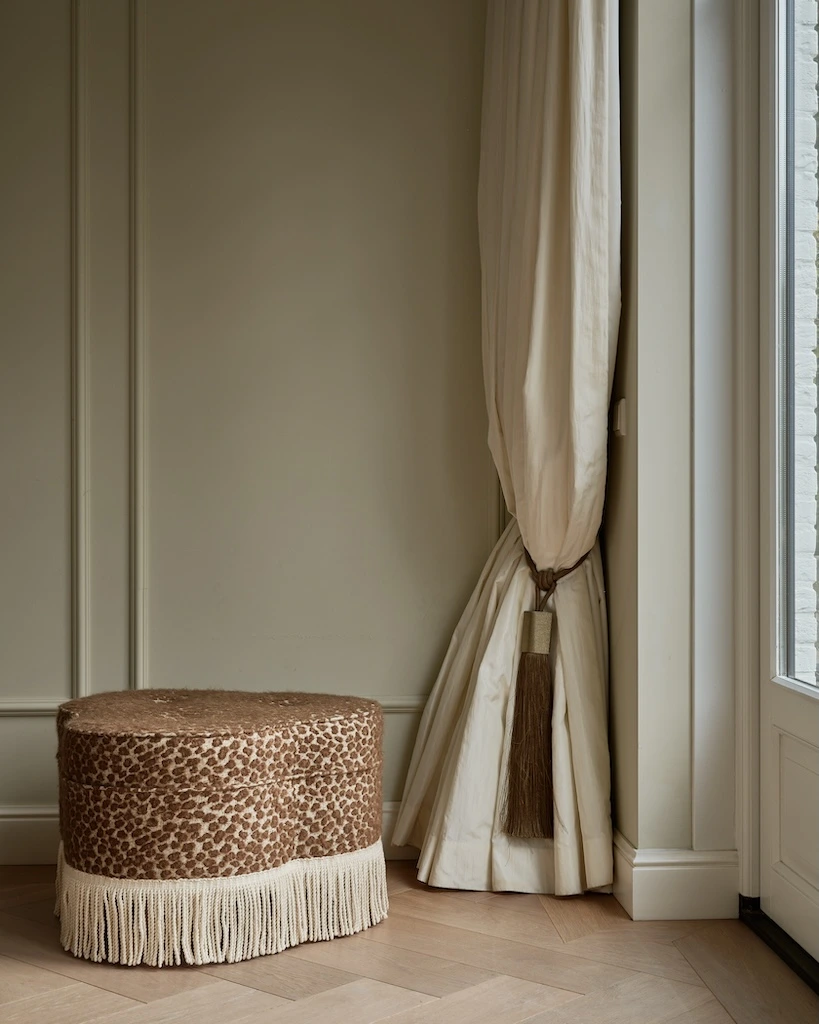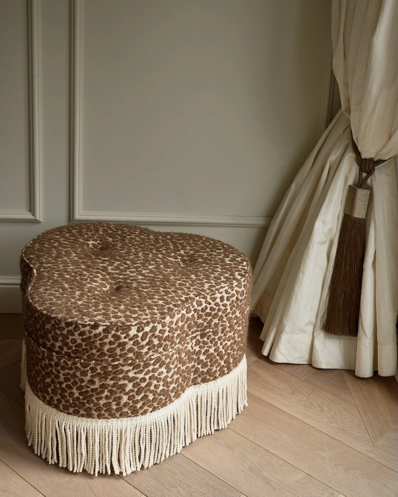 Meet Lucky, a charming clover-shaped pouf and a playful twist on the traditional round pouf and Laurent. Decorated with a fringe for added wow-factor, it's versatile enough to enhance any space — from living rooms to bathrooms or dressing rooms. Upholstered in a beautiful structured leo fabric from Elitis it fits as nicely in a living room as it does a walk-in closet. Lucky is like the necklace to nail the outfit. This piece belongs to the collab collection between RIJD and Mimi Basart from "The Interior Guide". Made in EU.