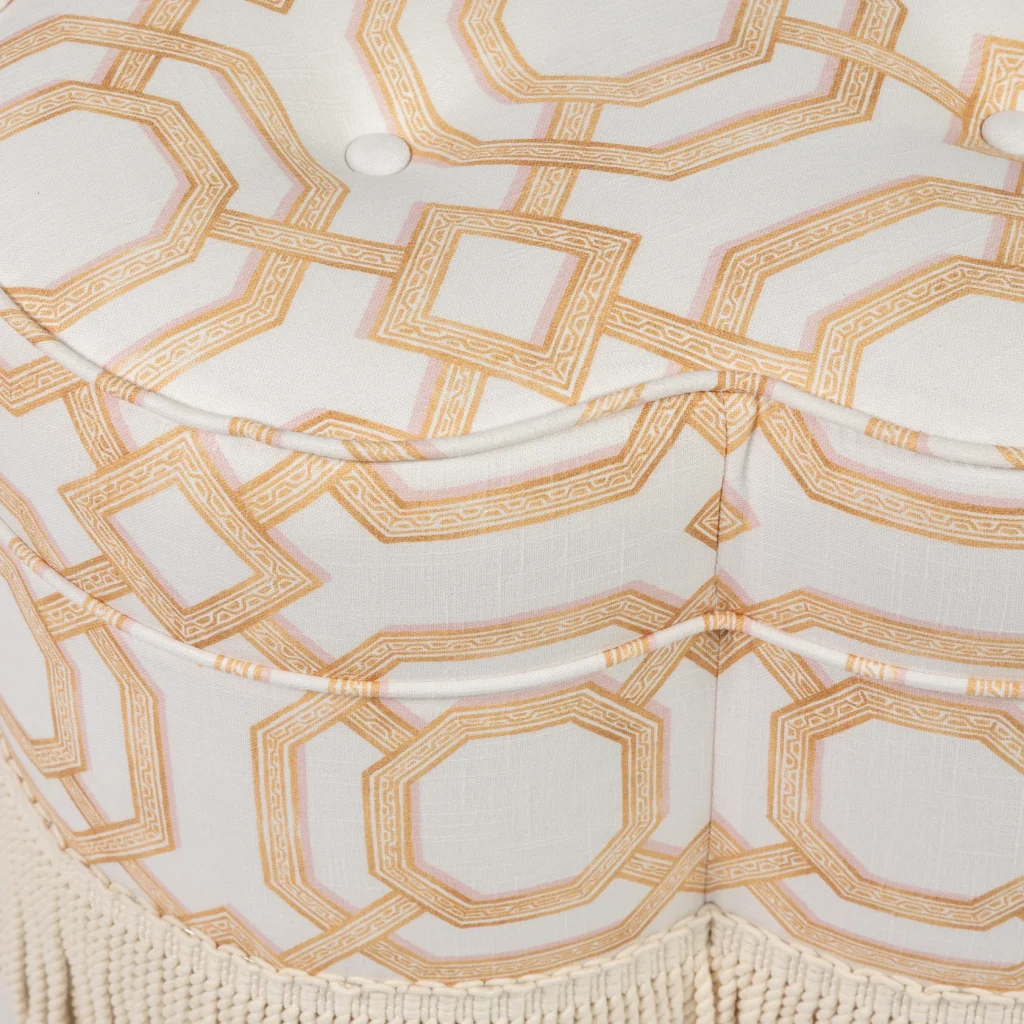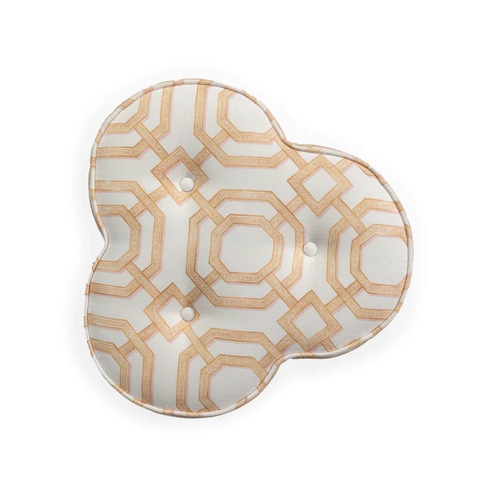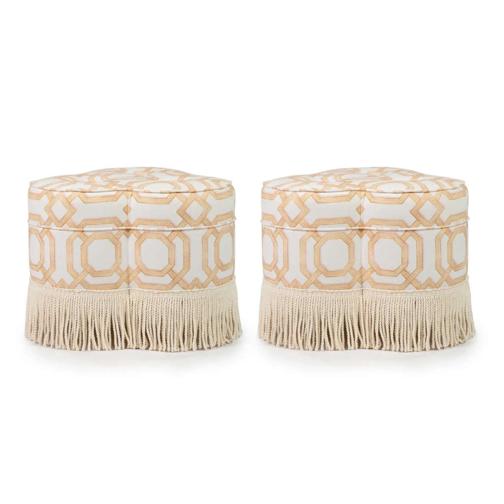 Meet Lucky, a charming clover-shaped pouf and a playful twist on the traditional round pouf and Laurent. Decorated with a fringe for added wow-factor, it's versatile enough to enhance any space — from living rooms to bathrooms or dressing rooms. It fits as nicely in a living room as it does a walk-in closet. Lucky is like the necklace to nail the outfit. This pouf is upholstered in a cotton fabric with a beautiful pattern. Made in EU.