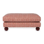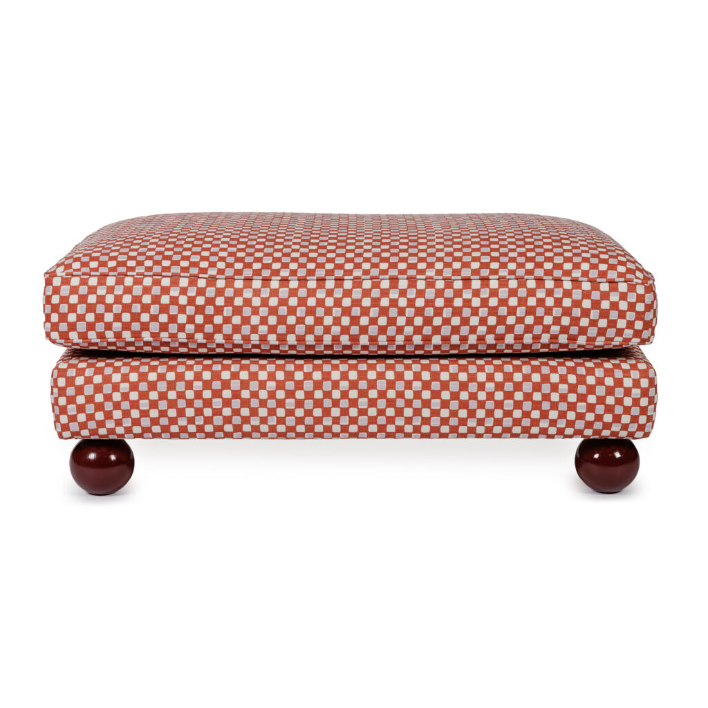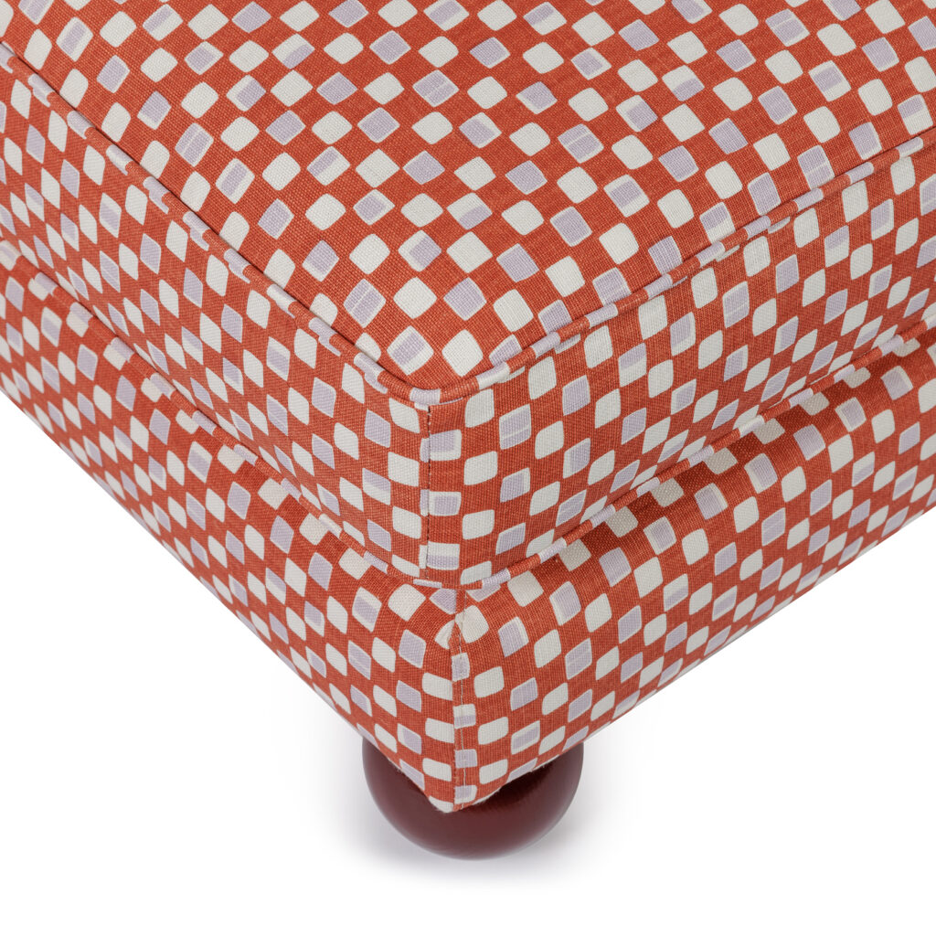 A foot stool, a pouf, an ottoman, a table? This camelion is lending itself to all occasions. We love how it can go from formal to informal easily with just styling. A fringe adds decadence, exposed legs some panache and a skirting feels very posh. Choice is yours. This Maxim is upholstered in the geometric, small scale print "Faye" fabric from Cathy Nordström. It is inspired by a 1950s pattern from one of Cathy’s many American textile and quilting books. The fabric together with the round wooden legs in color 'Sang de boeuf' make this ottoman a real knockout! Made in EU.