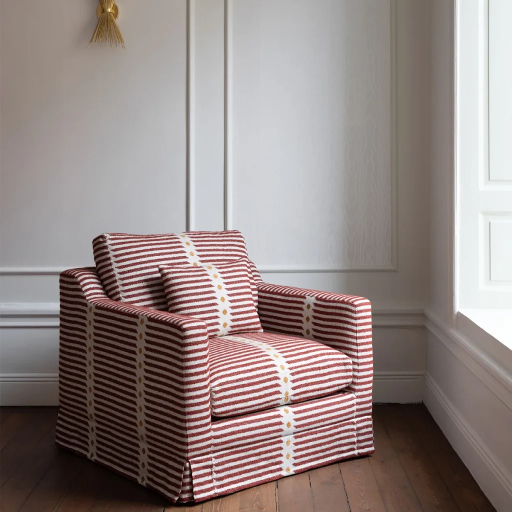 The lines follow it’s fellow namesake Orlando Sofa, with the curved armrests and the plush bolsters. It is big enough to be comfortable cur- ling up with a cup of tea, but nimble enough to allow for pairing in two. The foundation of the lounge chair is solid wood, upholstered in lus- hious fabric of choice. It can be adorned with fringes, trims and piping as well as staying just as it is. Each to their own. The thought is that the baseline of the design is so compelling that it works both with or without embellishments. We have created some of our own design favorites as we have a soft spot for prints and patterns.