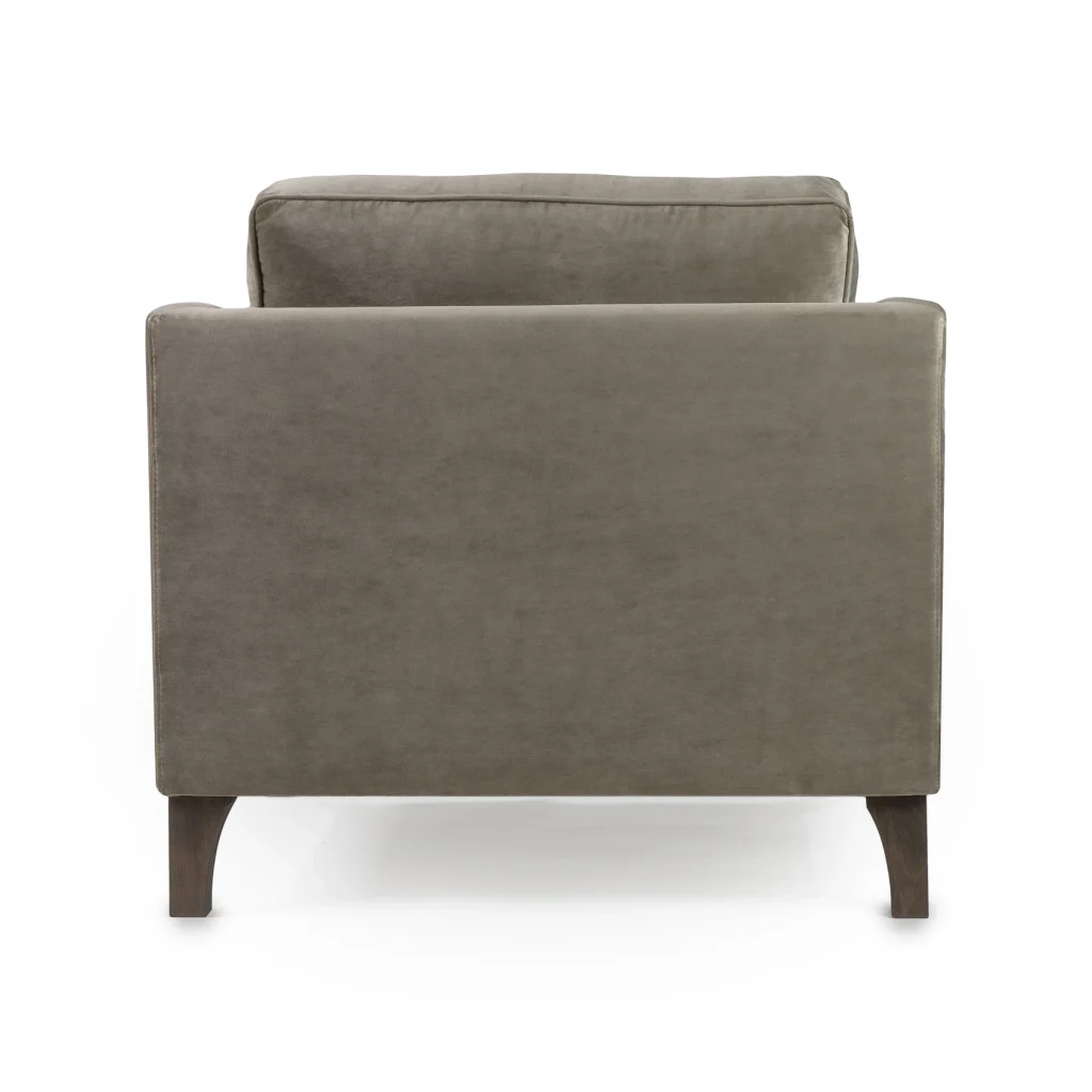 This particular chair is dressed in a durable velvet fabric. The exposed legs are in solid wood.