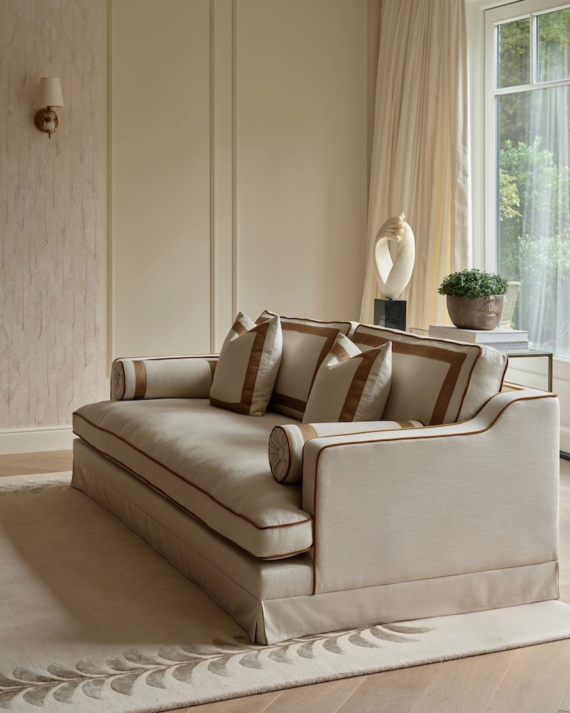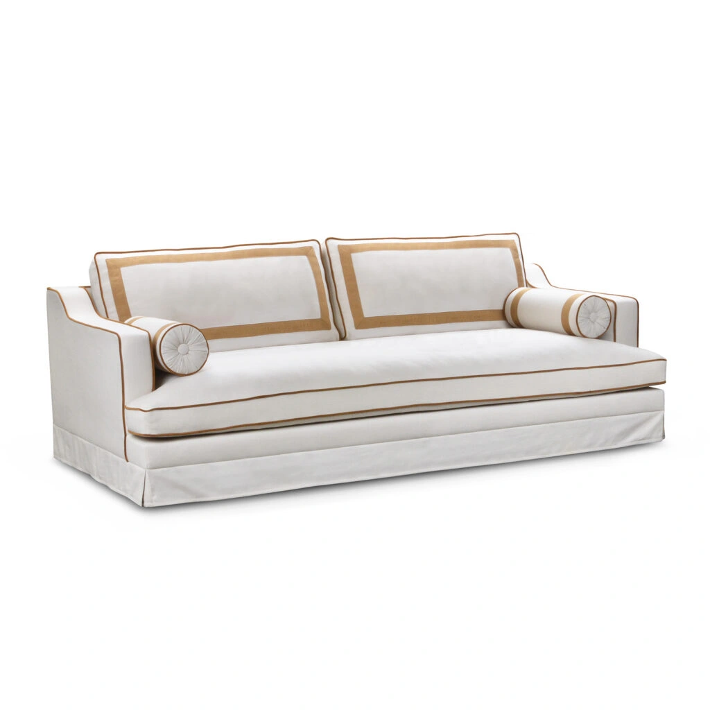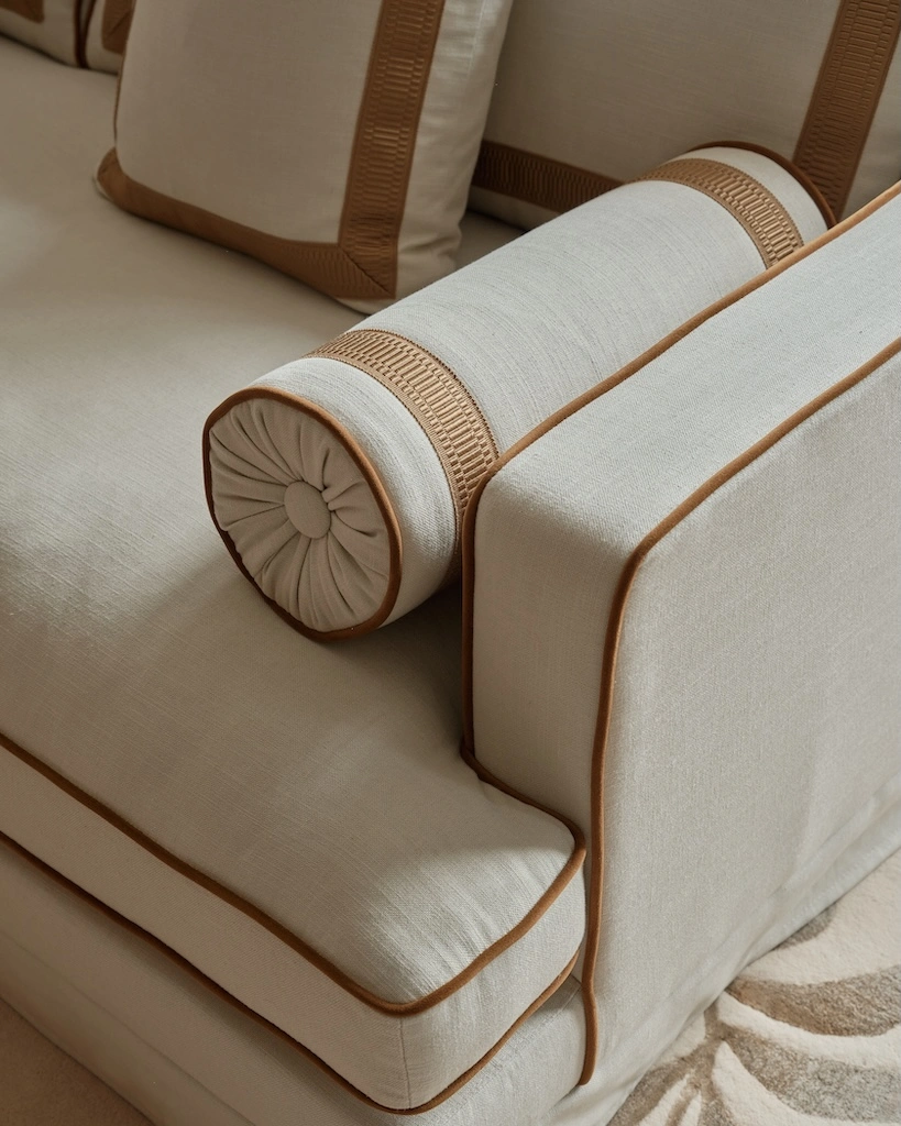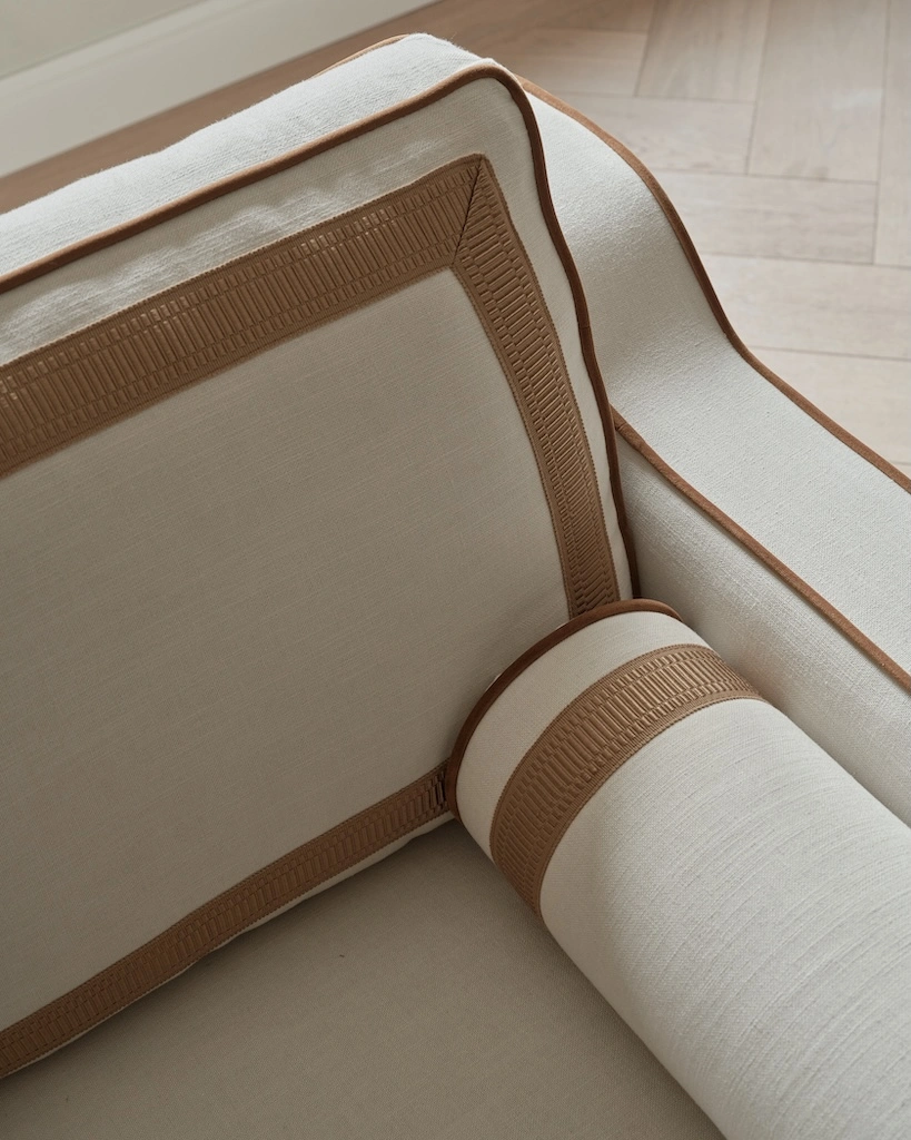 RIJD x The Interior Guide: An updated version of Orlando - luxurious statement sofa inspired by vintage Hollywood Glamour with a modern twist. Upholstered in a light-colored easy clean fabric with contrasting trimmings from Houles in caramel brown. This Orlando features some updates as it has one seat cushion instead of two, has decorative tapes on the backrests and has a skirt instead of the original fringe. It belongs to the collab collection between RIJD and Mimi Basart from "The Interior Guide" and is offering exceptional comfort this high-quality piece is crafted in EU.