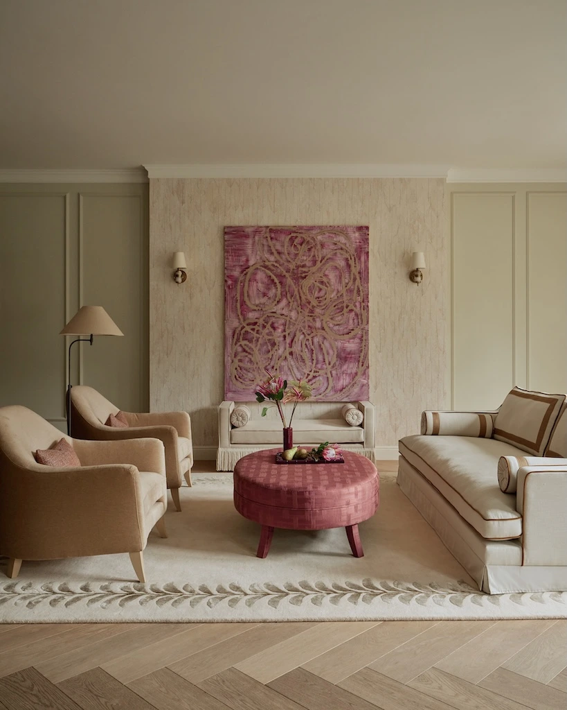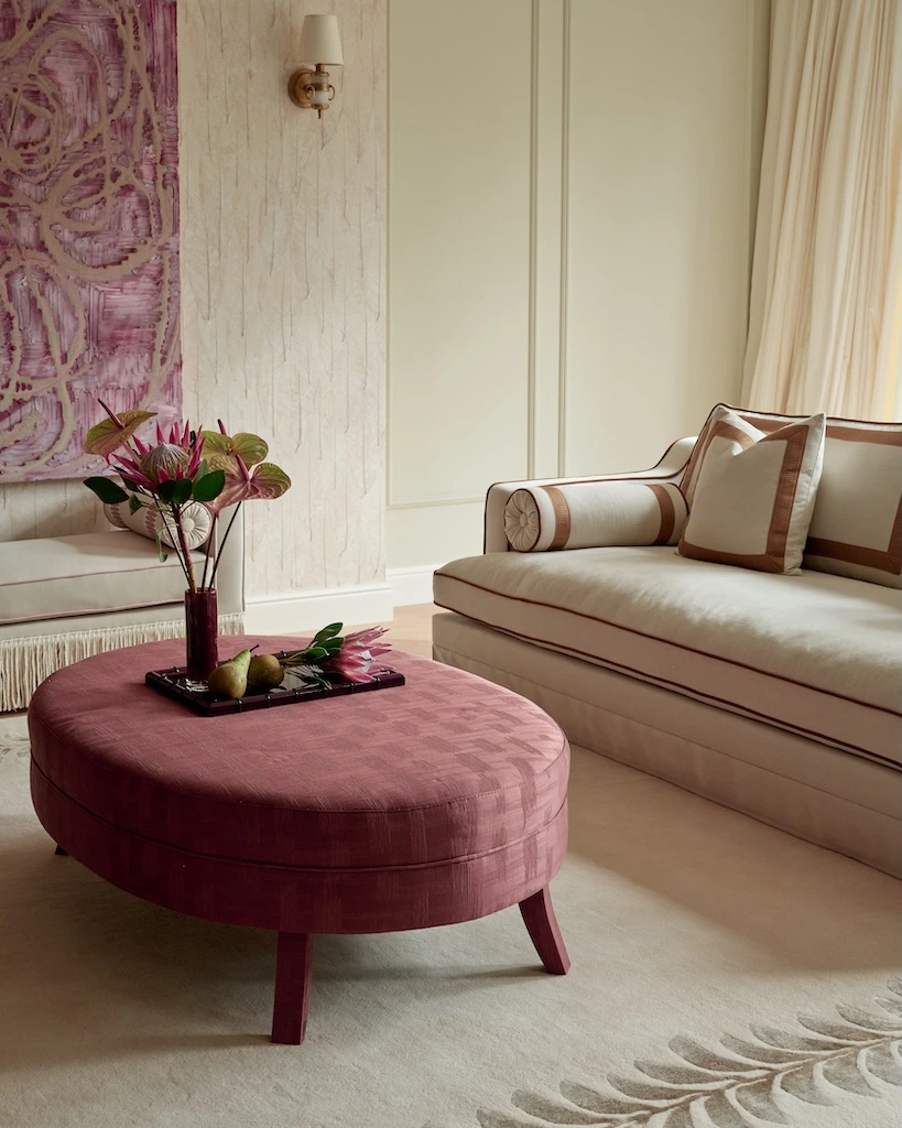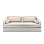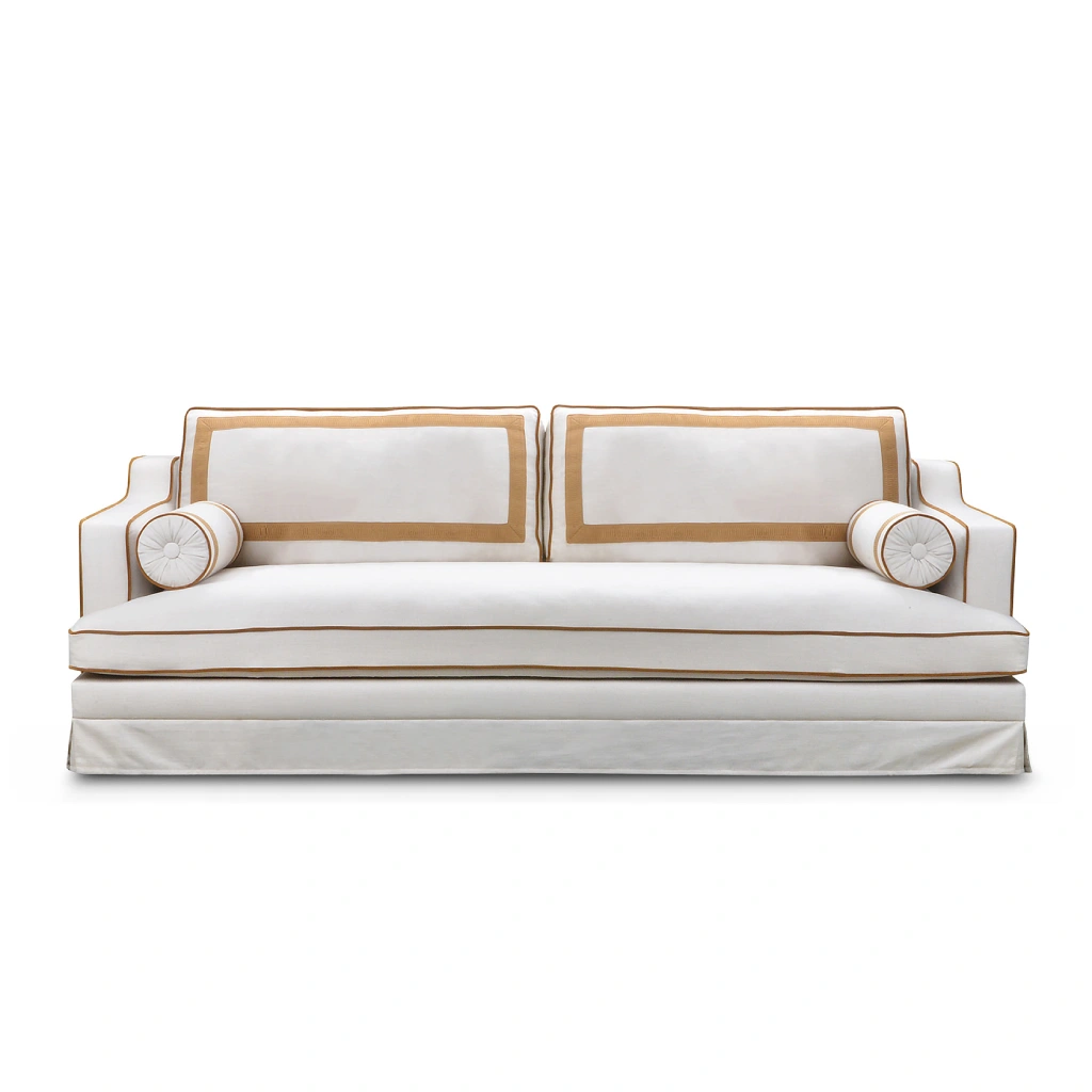 RIJD x The Interior Guide: An updated version of Orlando - luxurious statement sofa inspired by vintage Hollywood Glamour with a modern twist. Upholstered in a light-colored easy clean fabric with contrasting trimmings from Houles in caramel brown. This Orlando features some updates as it has one seat cushion instead of two, has decorative tapes on the backrests and has a skirt instead of the original fringe. It belongs to the collab collection between RIJD and Mimi Basart from "The Interior Guide" and is offering exceptional comfort this high-quality piece is crafted in EU.