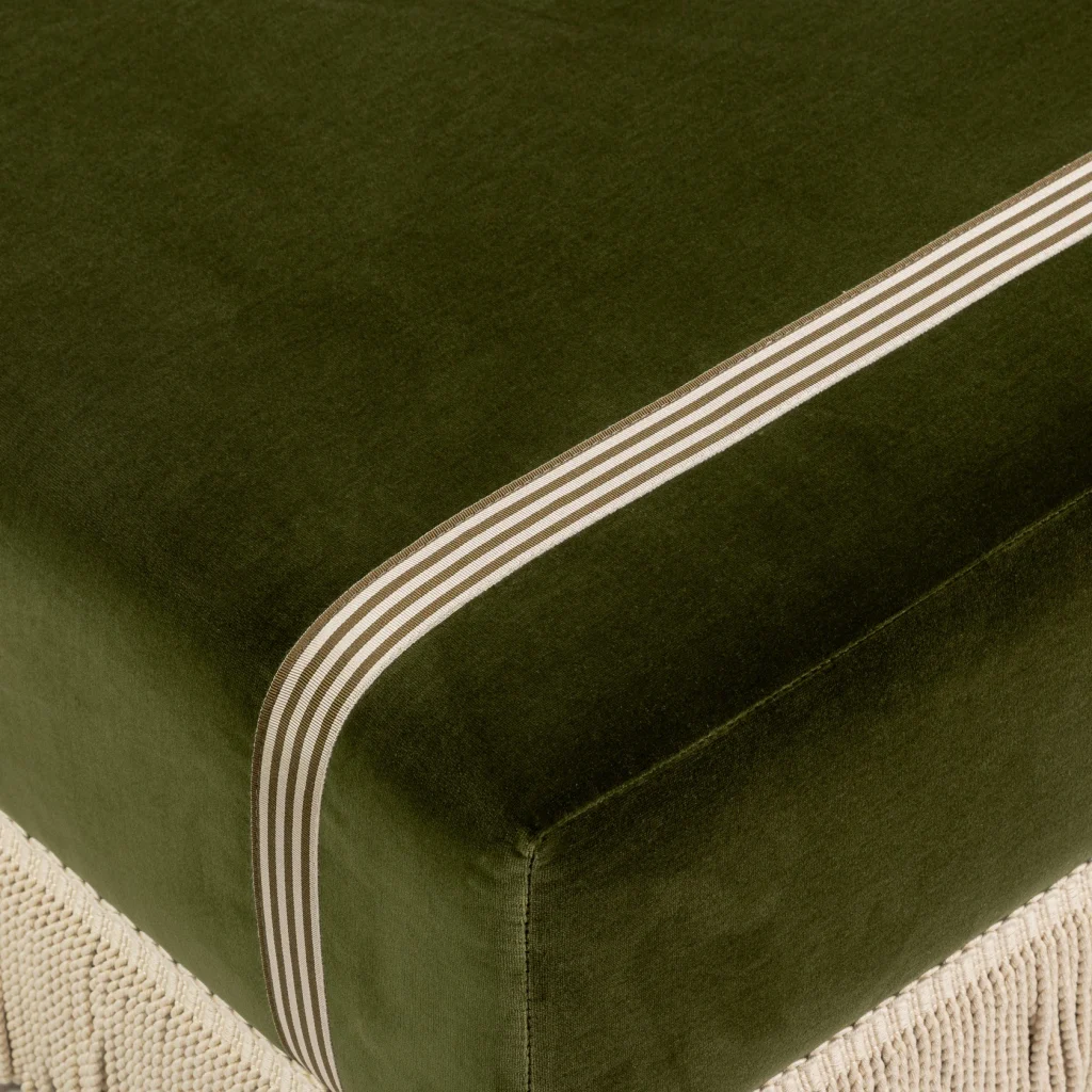 Dressed in plush green velvet, this statement ottoman brings warmth, texture, and a touch of tailored elegance to any living space. Its generous, structured silhouette makes it just as practical as it is beautiful. Use it as a coffee table or transition it into extra seating or a luxurious footrest. Thoughtful details elevate the design from the refined striped trim that traces its clean lines to the soft bullion fringe that adds a hint of vintage charm. Whether styled at the center of your seating area or used as a multifunctional accent piece, this ottoman is a sophisticated alternative to the traditional coffee table. Made in EU.
