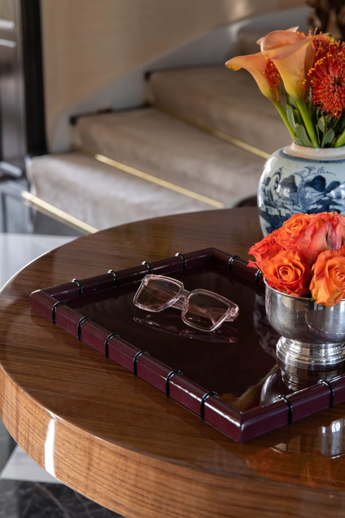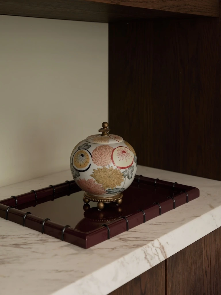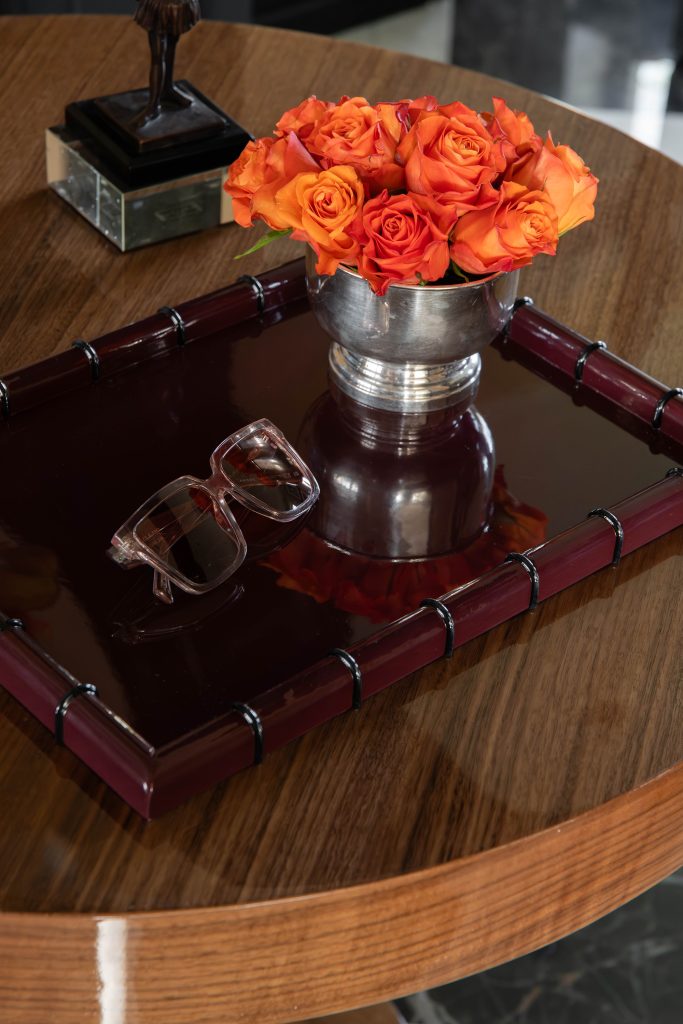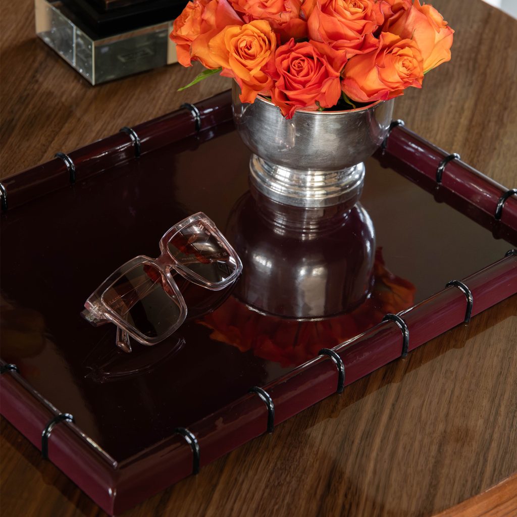 RIJD Bamboo Trays are crafted to combine organic beauty with contemporary shine. Each tray features a sleek high-gloss finish that adds a sophisticated, polished edge. Available in four stunning colors, these trays are perfect for any décor: from minimalist modern to cozy boho chic. Use them to serve drinks in style, organize essentials, or simply as a statement piece on your coffee table, vanity, or console. Bamboo tray adds warmth, color, and sophistication to your home. Even the smaller pieces can make your home sparkle. This piece is lacquered in an opulent red color.